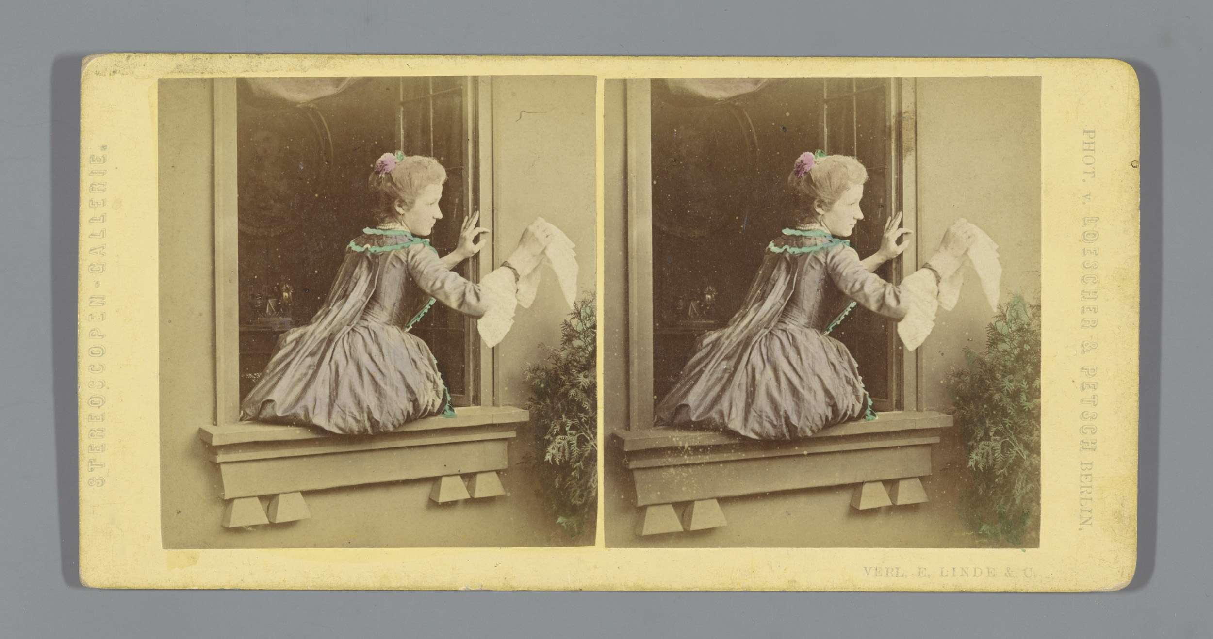 Een vrouw hangt met een zakdoek al wuivend uit het r...