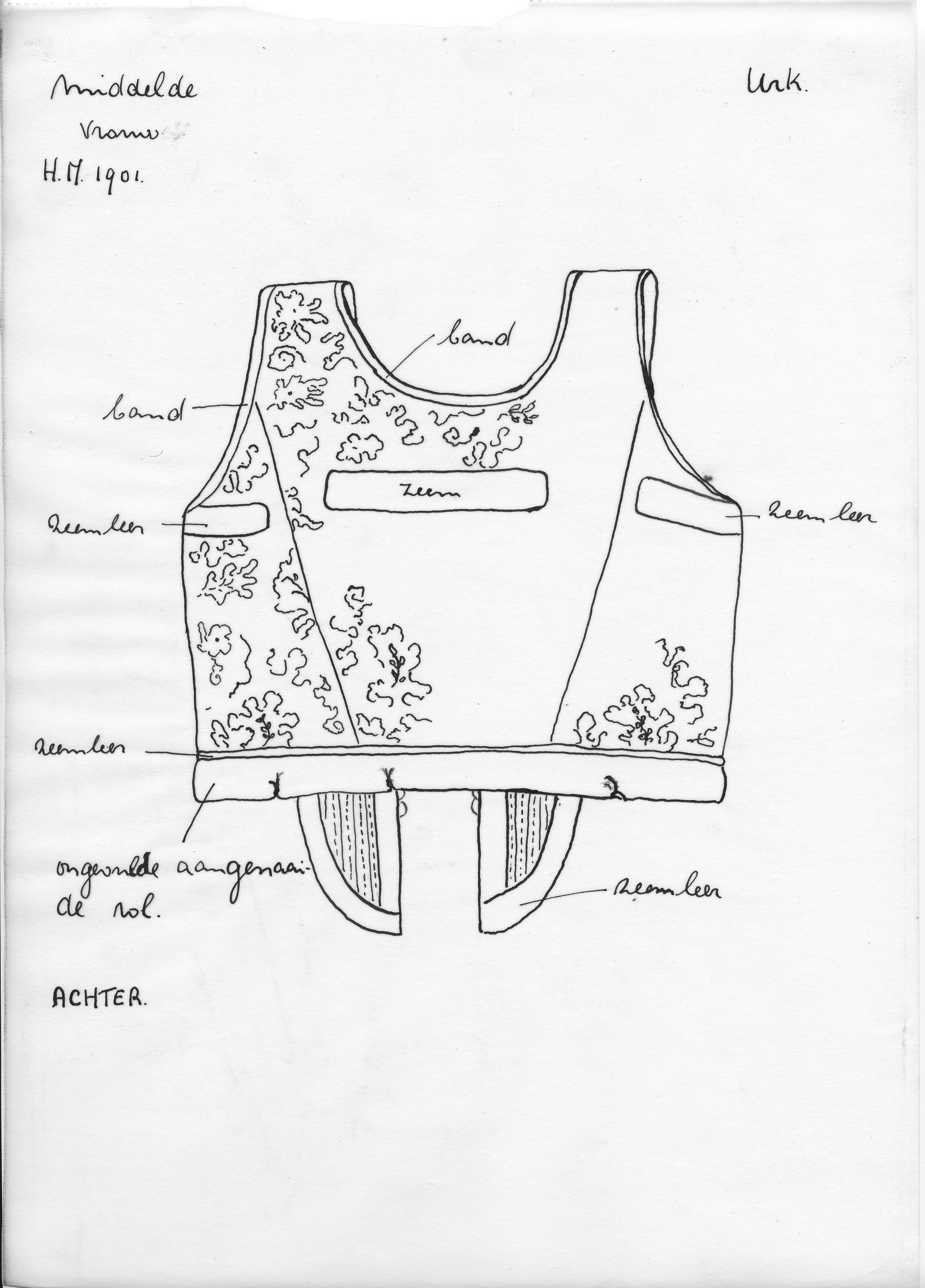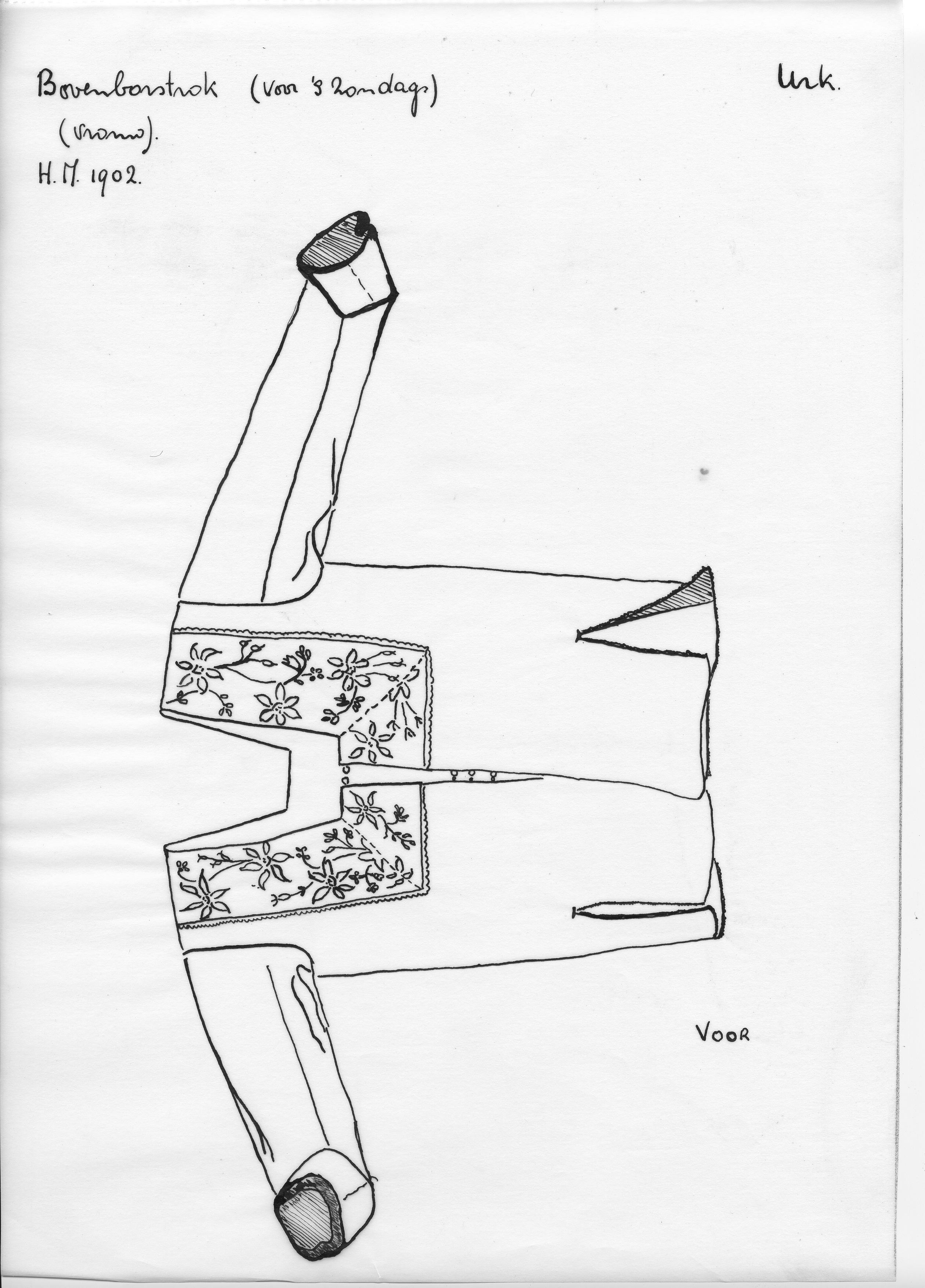 Tekening van een zondagse vrouwenbovenborstrok, Urk ...