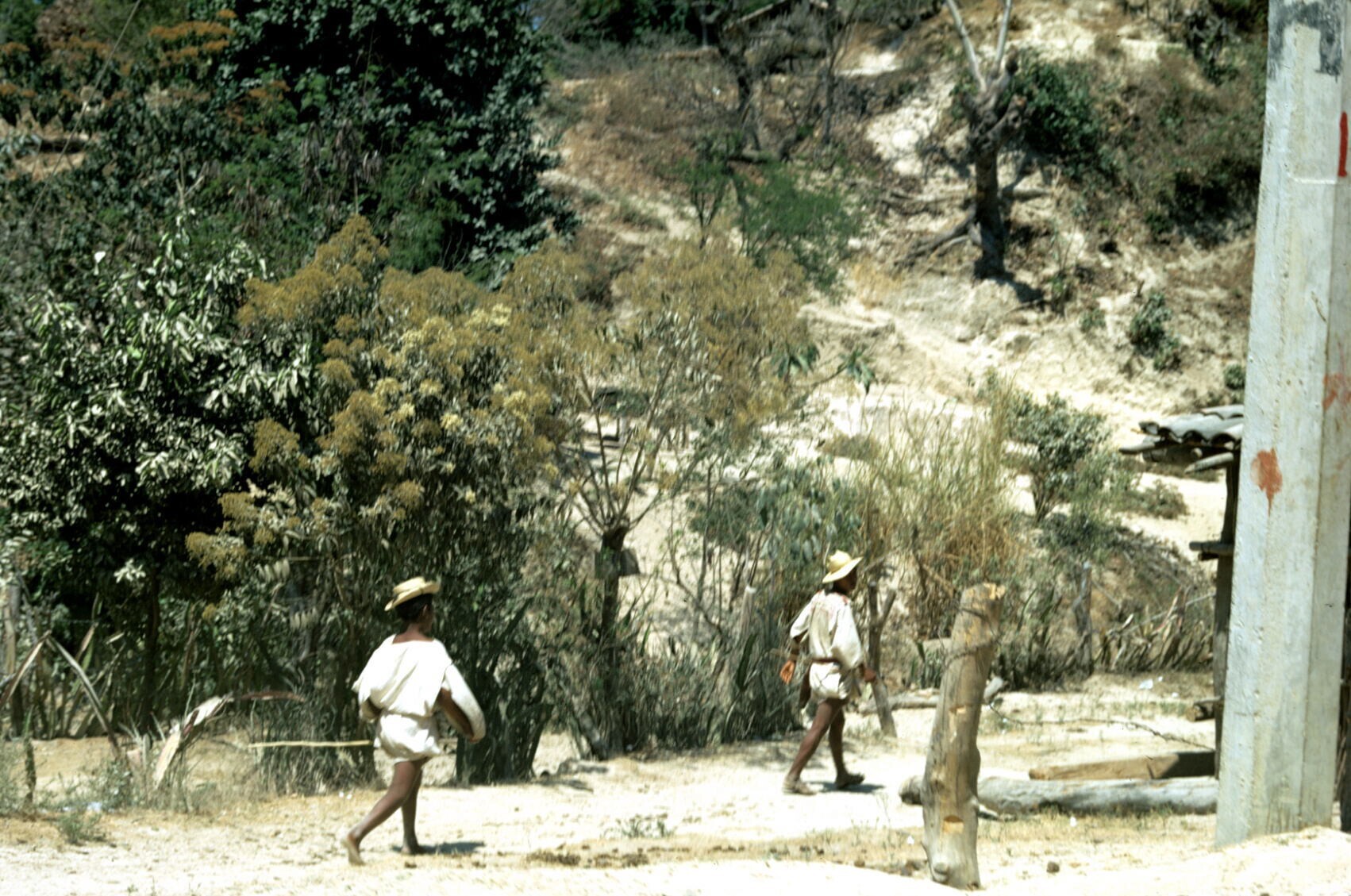 man in lokale dracht (z.g. "tacuate") in dorpsstraat