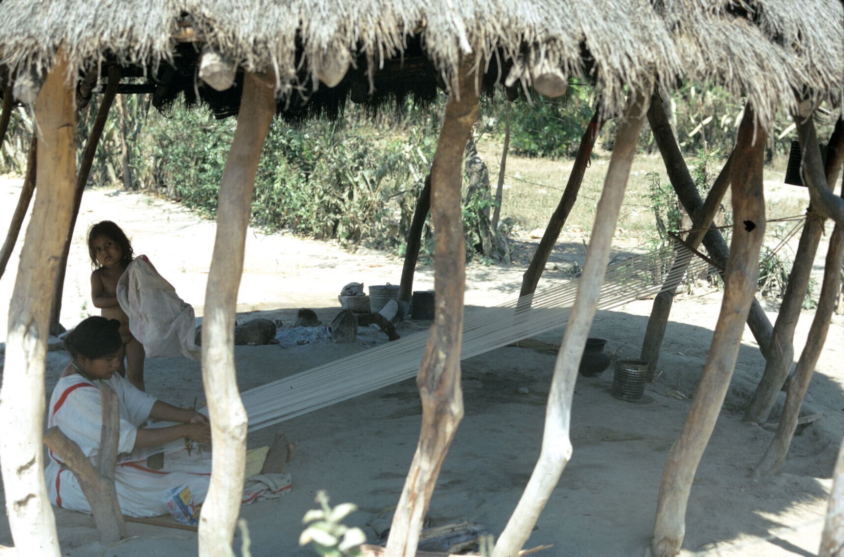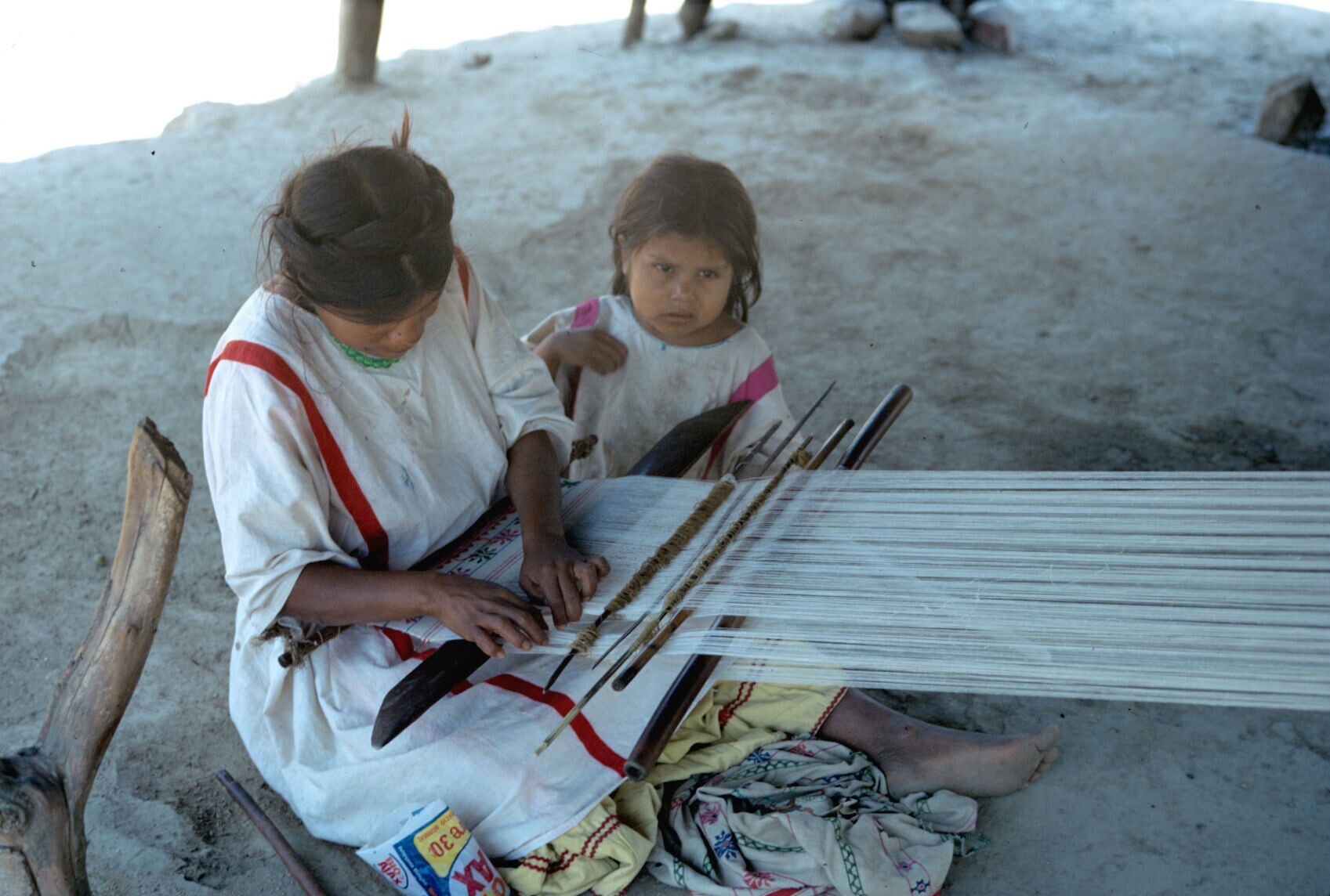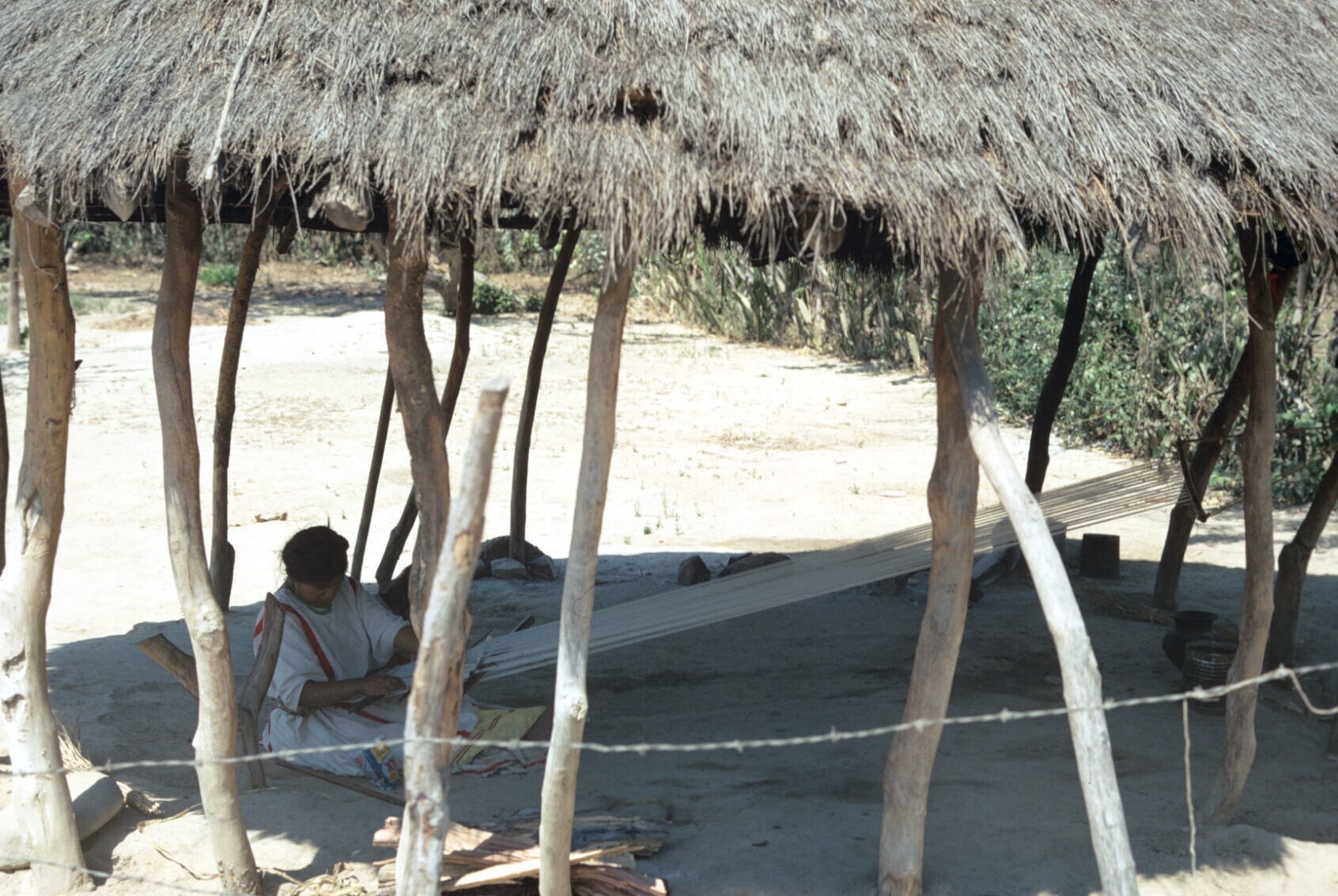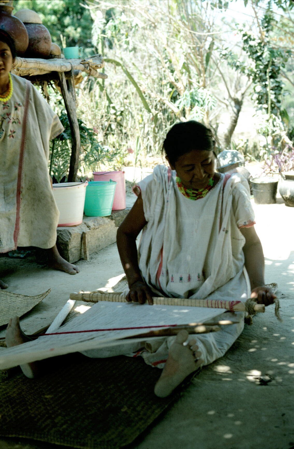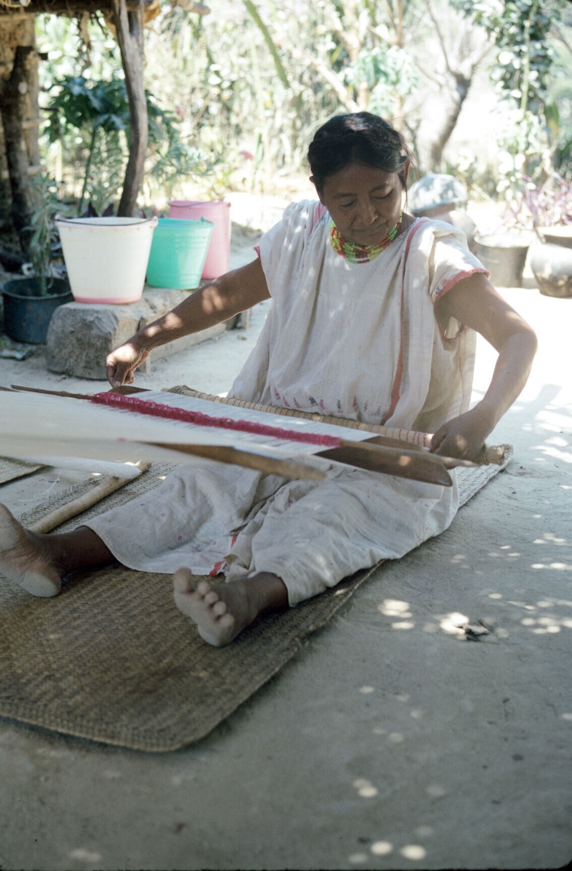 weefster Teresa Caspar, wevend op heupweefgetouw