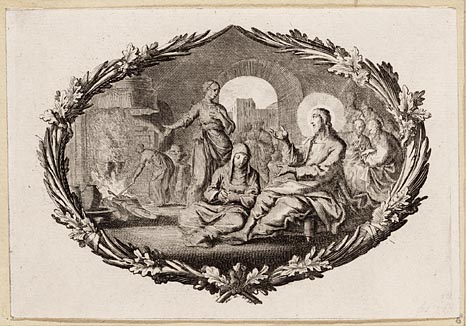 Jezus zit met Maria aan zijn voeten nabij een keuken...