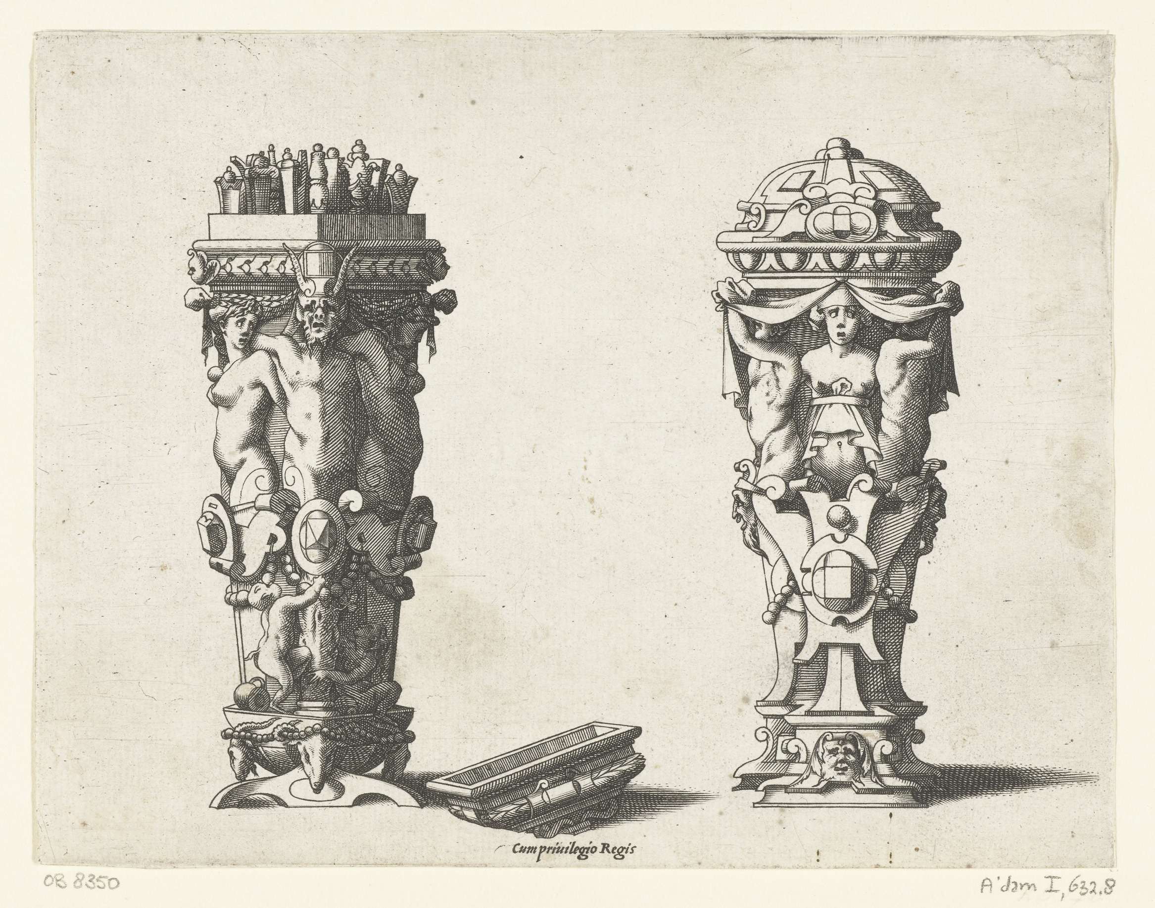 Op een tafel, gesteund door een gehurkte sater, staa...