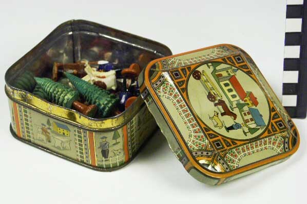 Blikje met 15 figuren, 4 bomen en 2 koeien