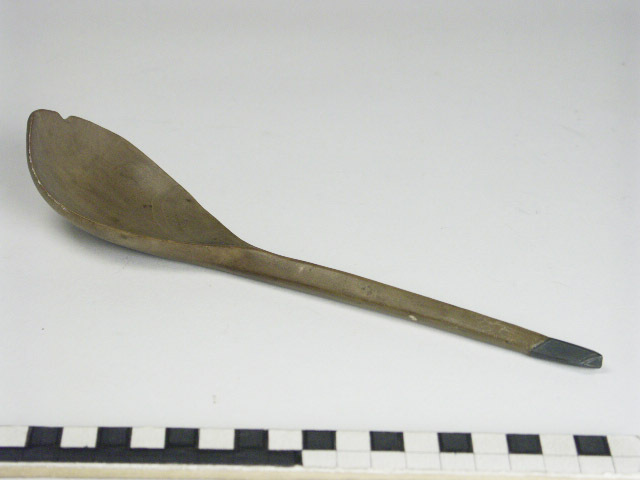 Houten lepel met tinnen beschermpunt aan het eind va...