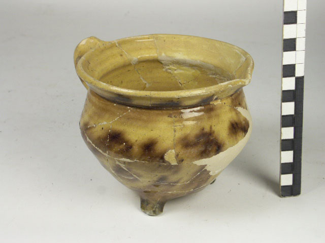 Grape van wit aardewerk met oor, geel geglazuurd met...