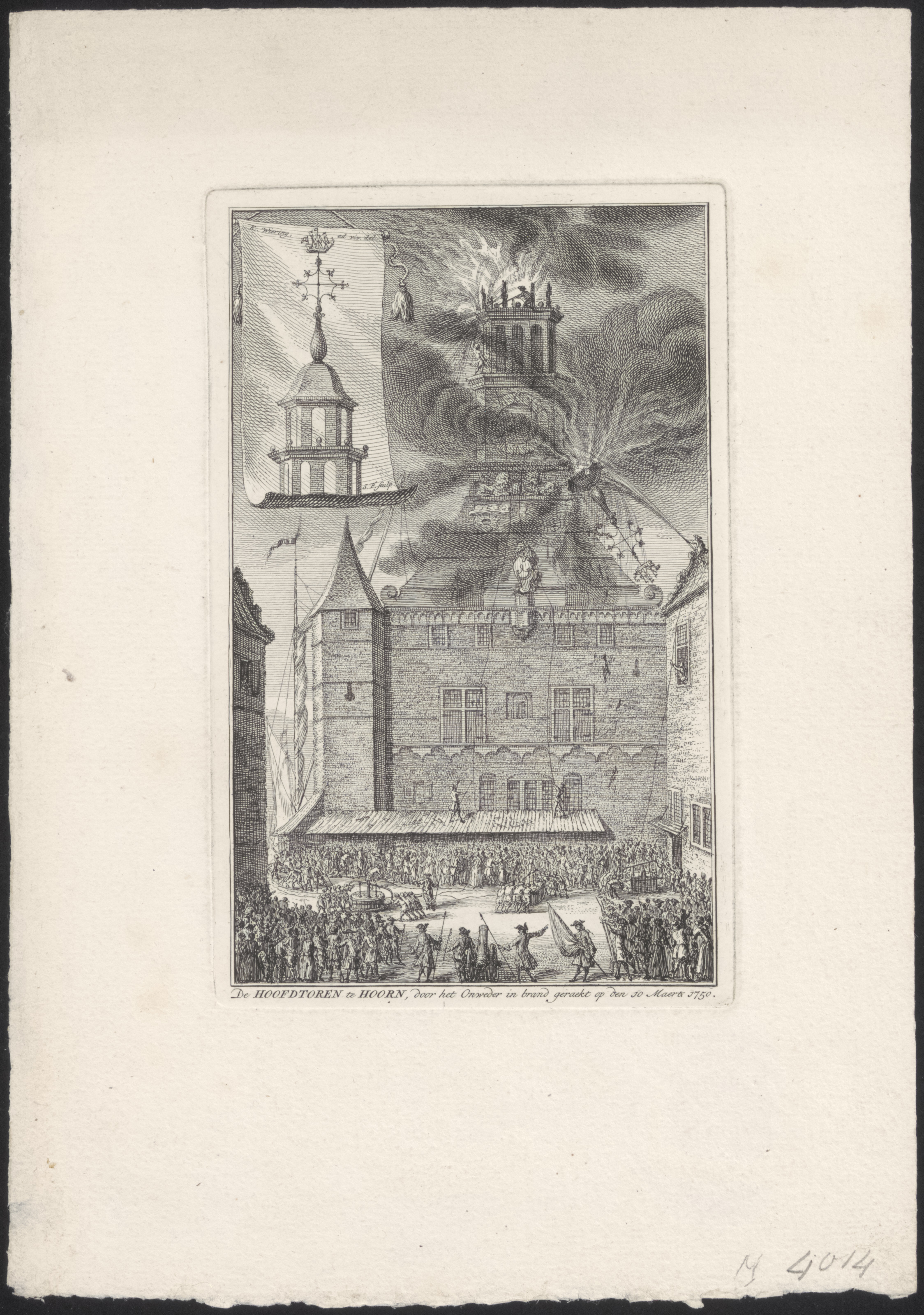 De hoofdtoren te Hoorn, door het Onweder in brand ge...