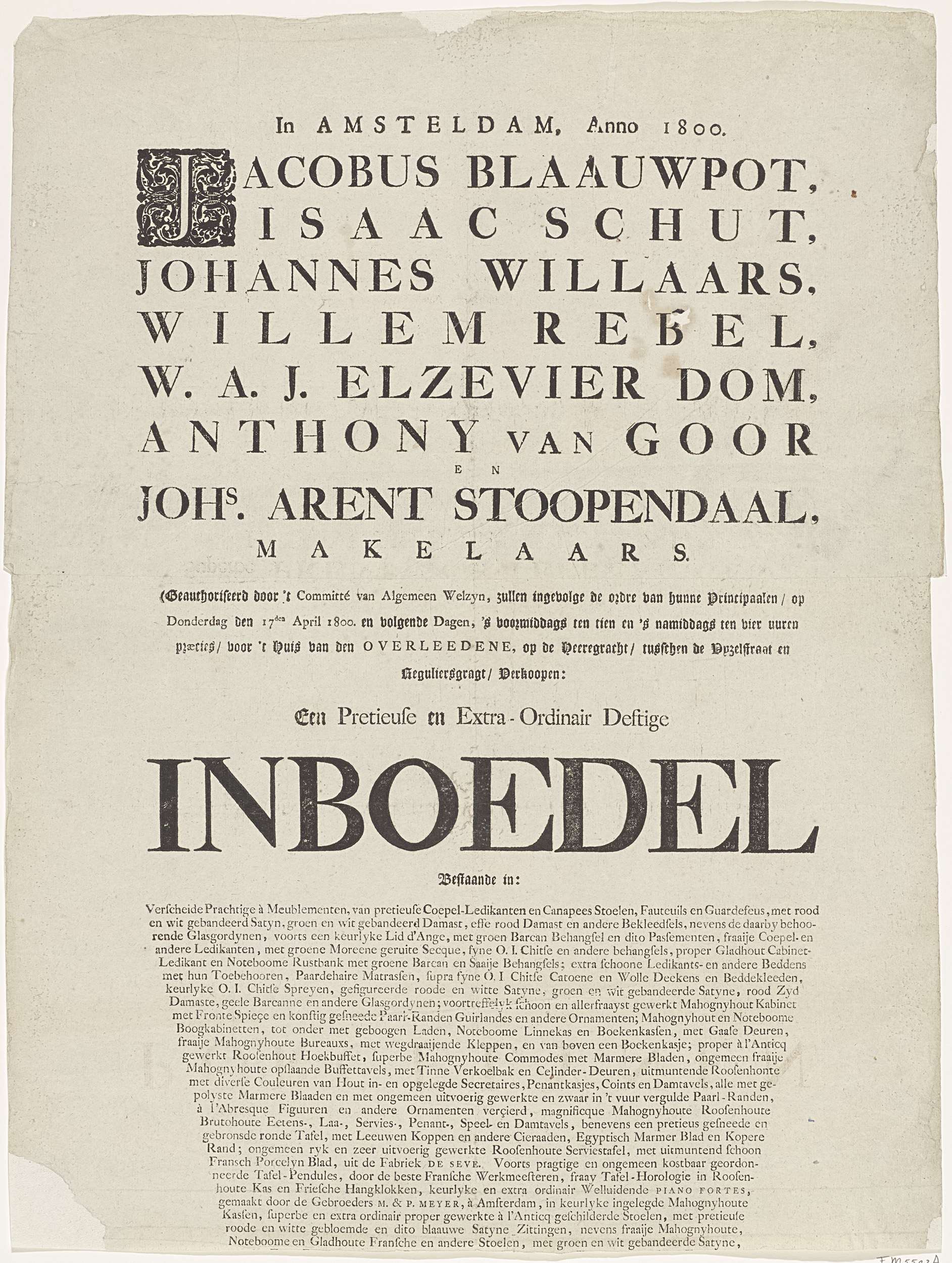 Bekendmaking van de veiling van een inboedel, 1800