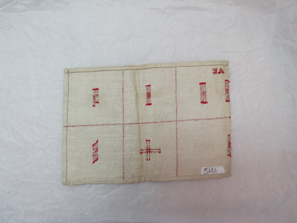 proeflap van linnen met rood stopwerk, gesigneerd AE...