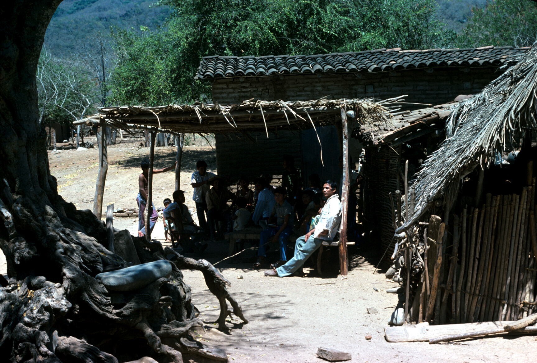 dorpeling, poserend bij basketbalterreintje