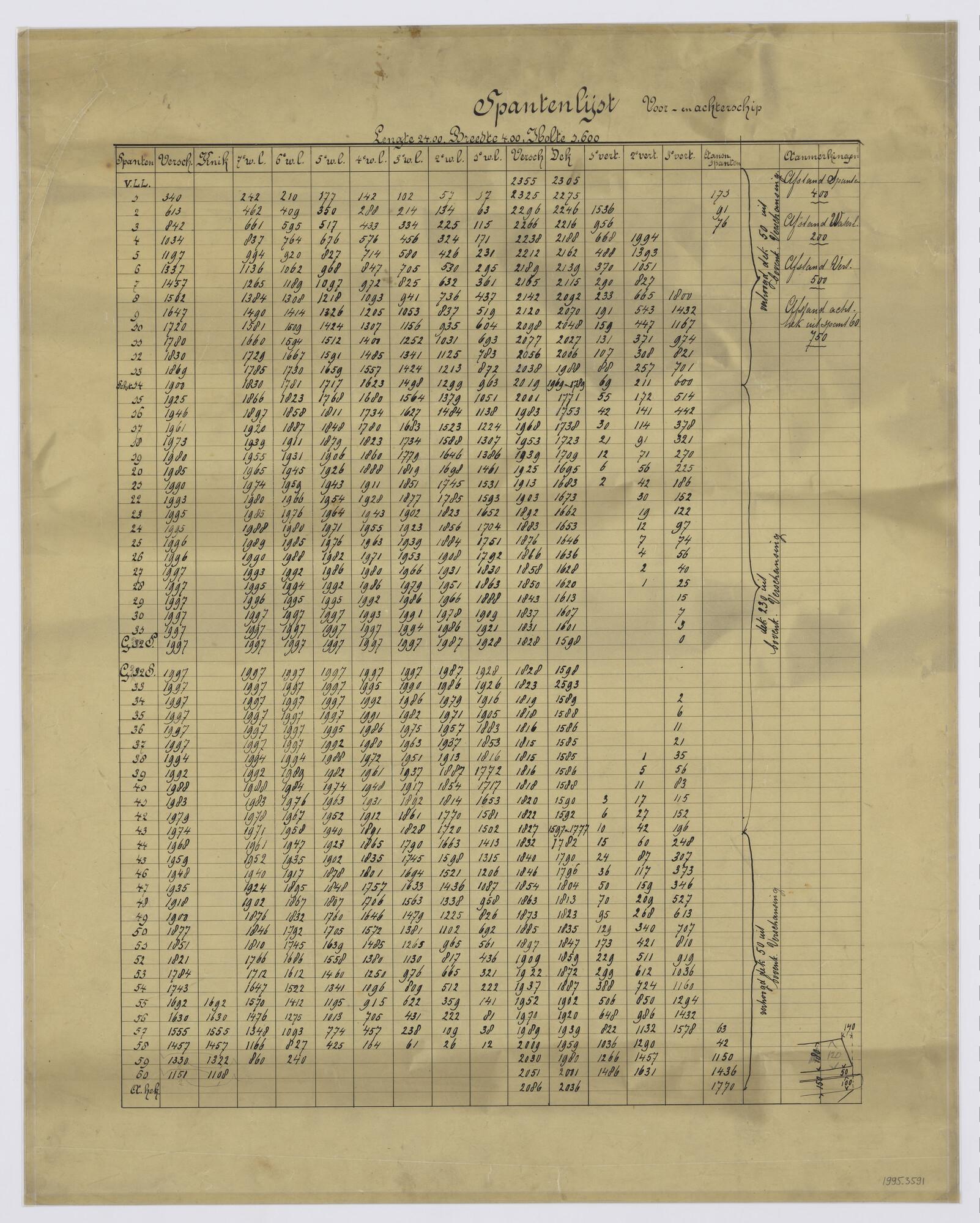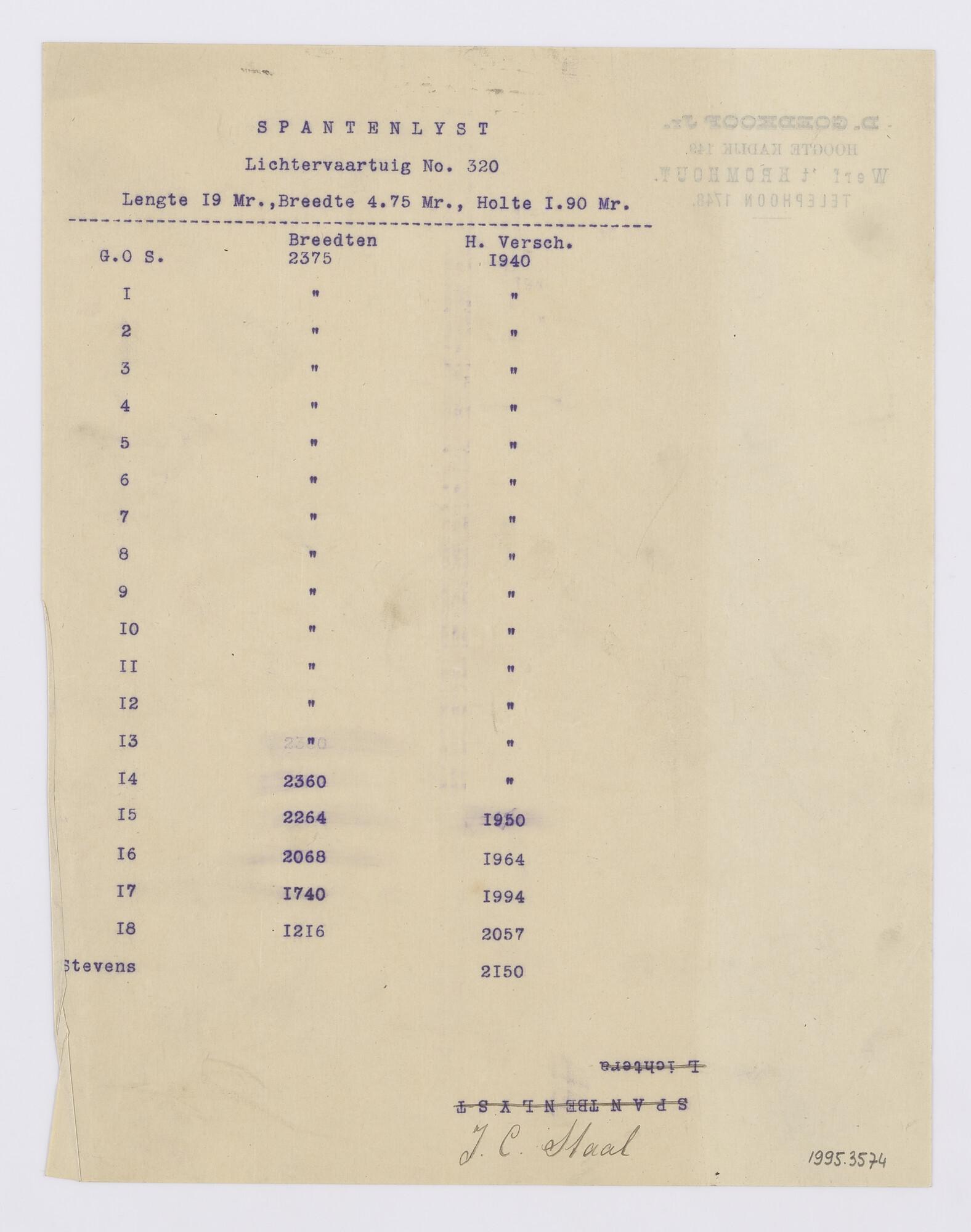 Spantenlijst van het vrachtschip ss. 'Johanna'