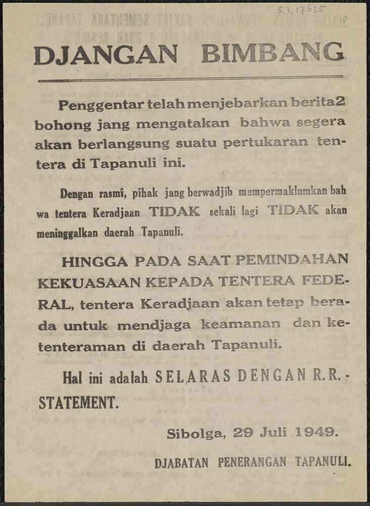 Indonesische propaganda pamflet in het maleis "Djang...