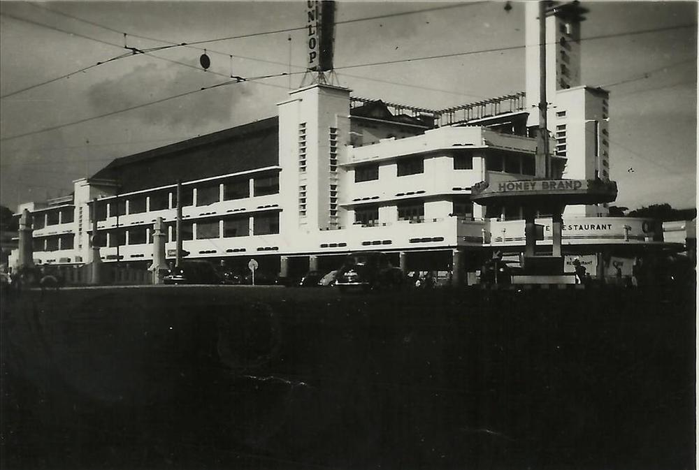 Nederlands Indië; wit gebouw, verdieping, reclame, D...