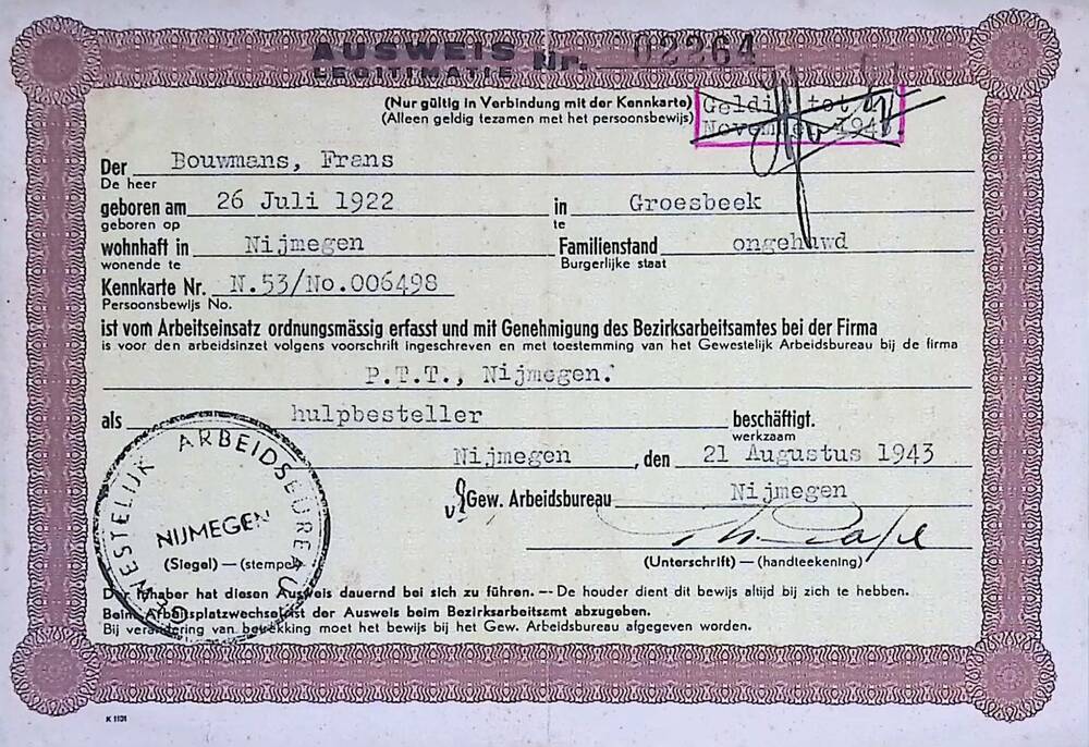 Ausweis, legitimatiebewijs op naam van F. Bouwmans