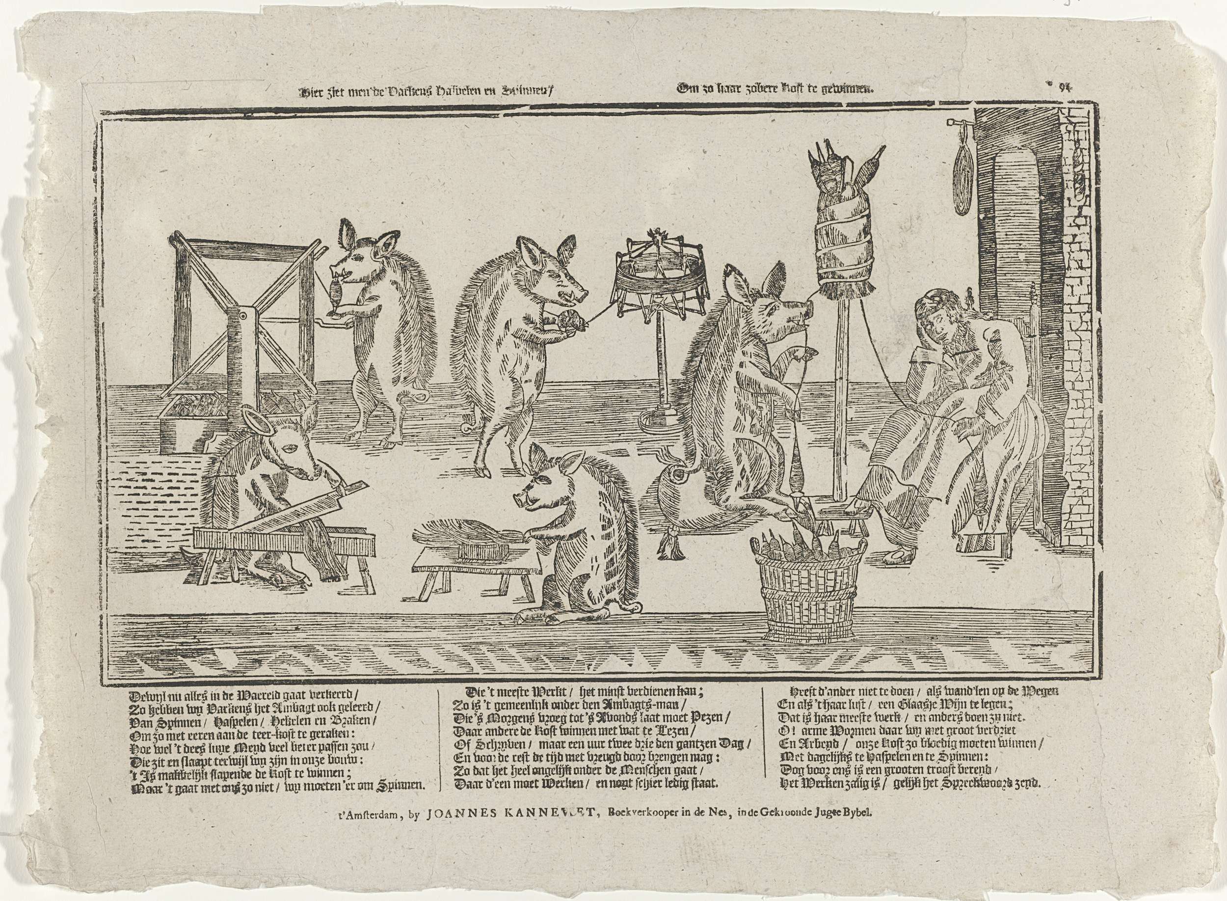 Hier ziet men de varkens haspelen en spinnen / Om zo...