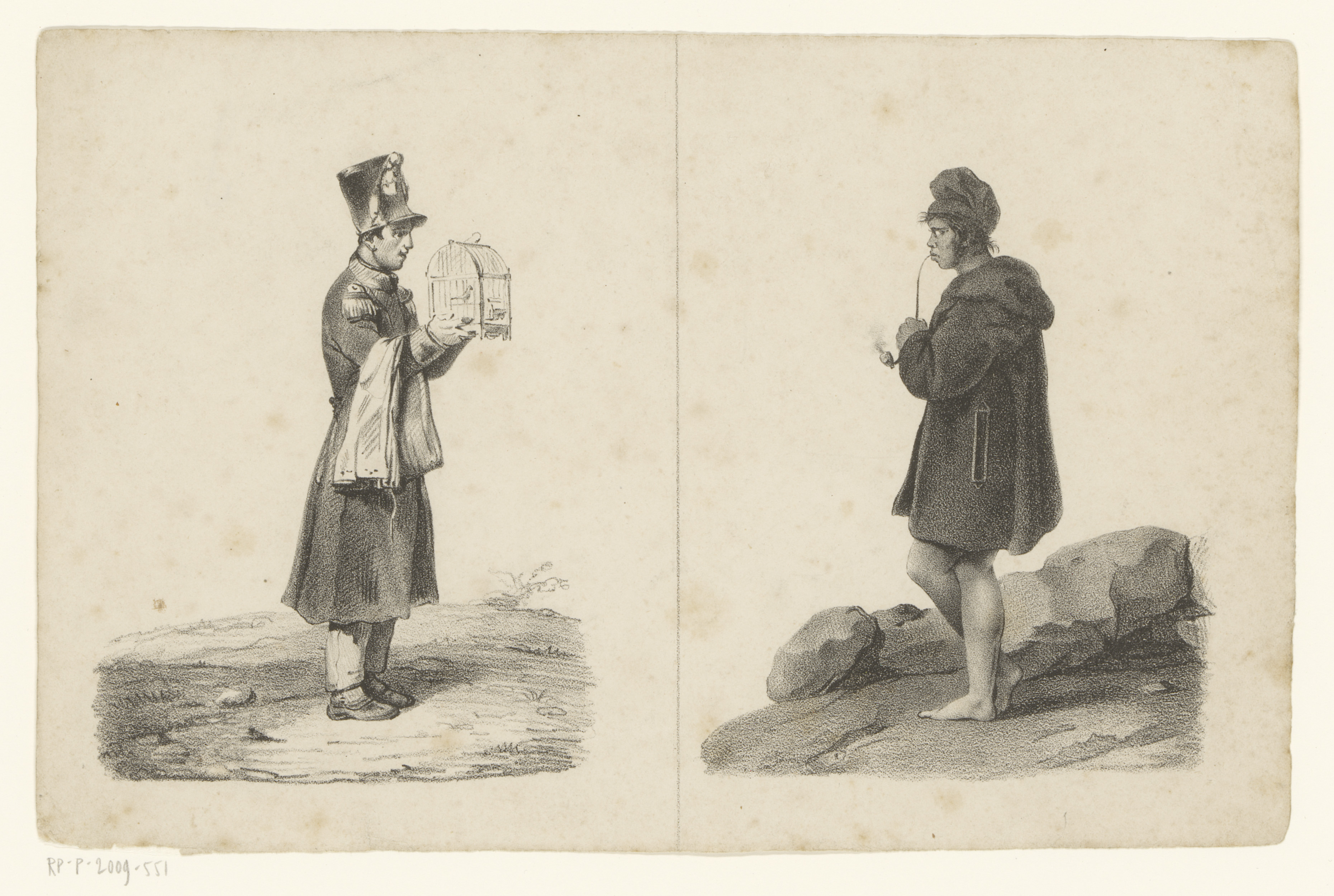 Soldaat met vogelkooi en pijprokende man