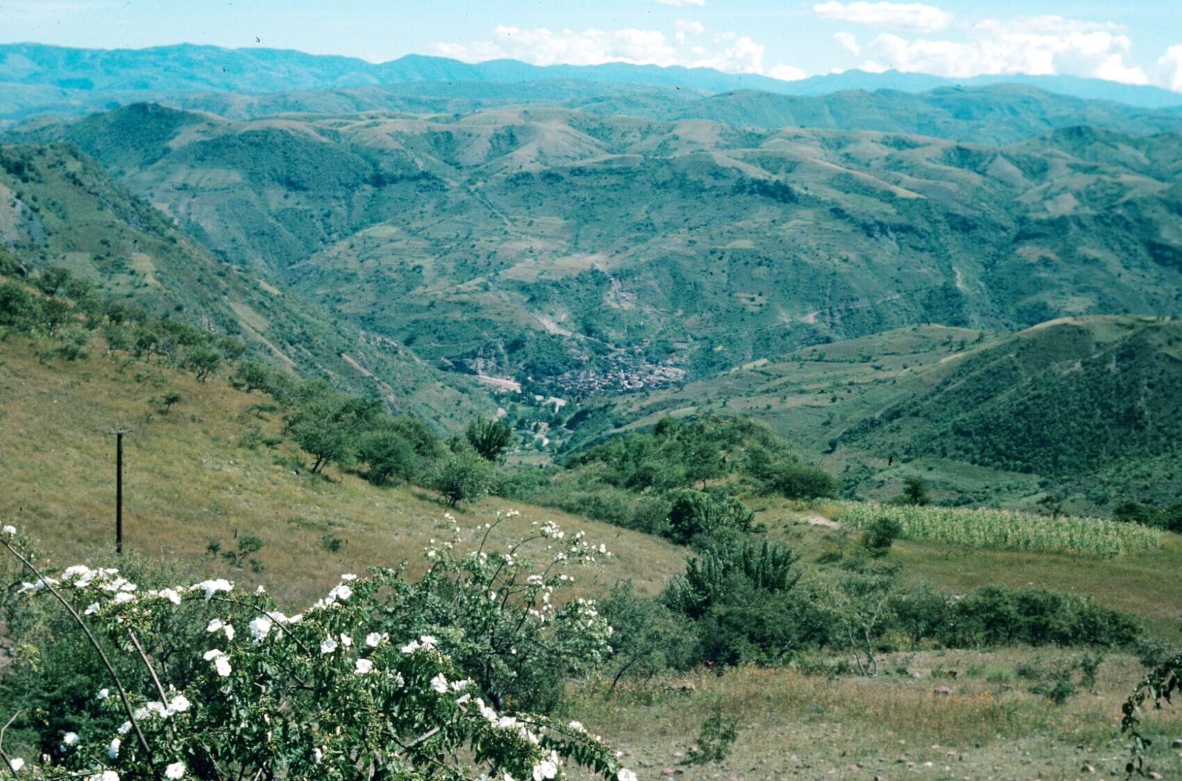 landschap met bergen, palmen en maïs