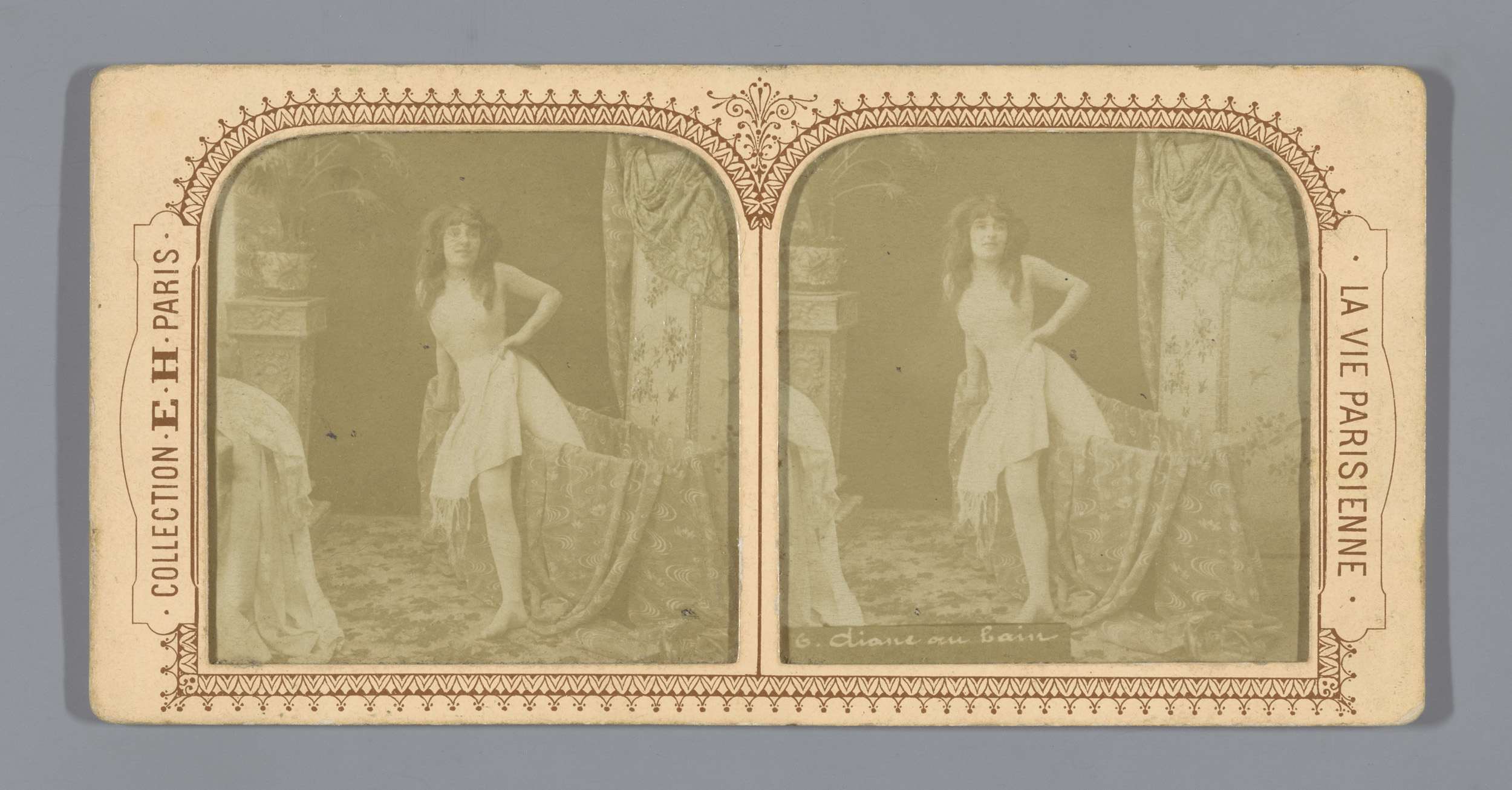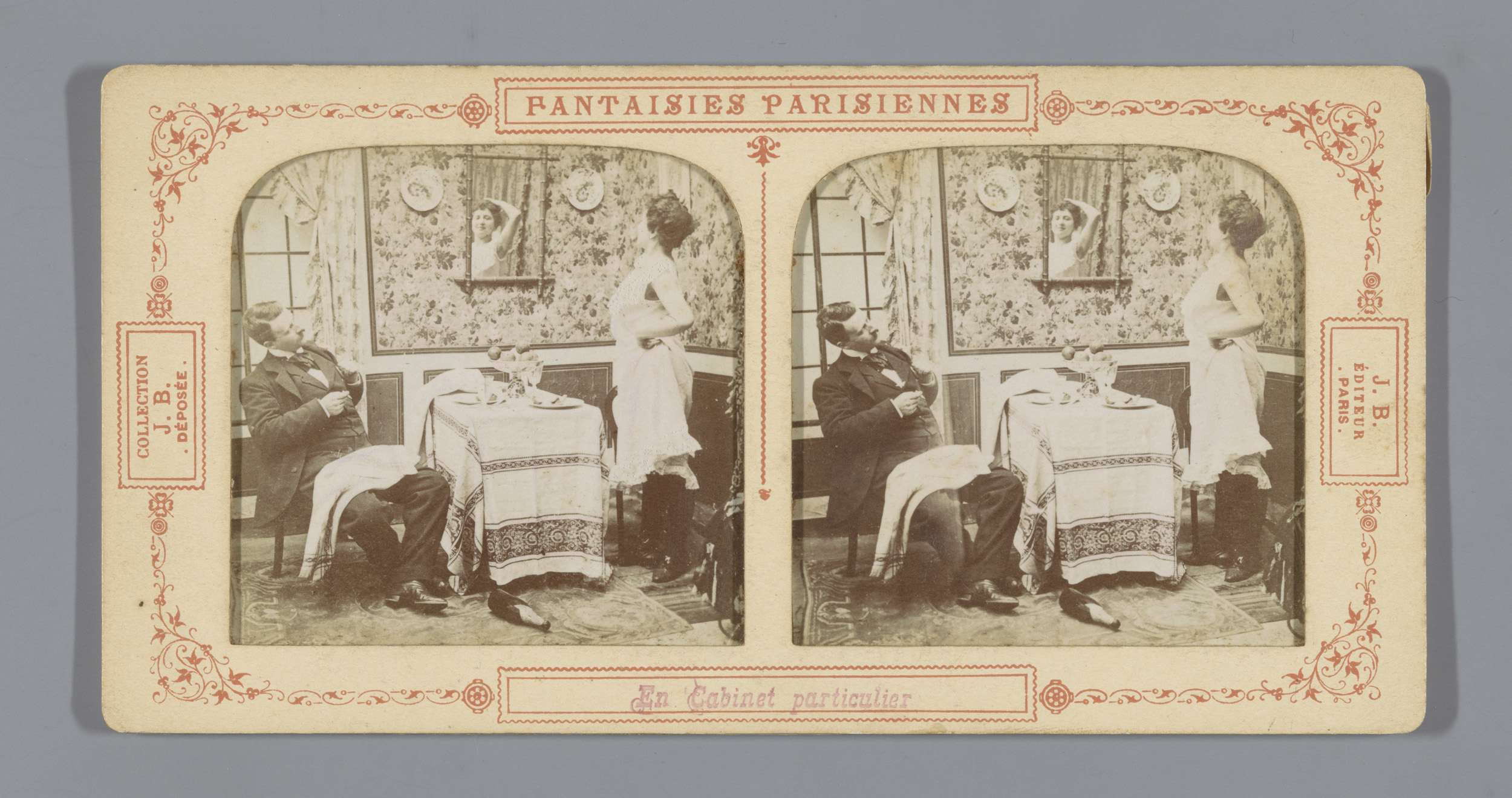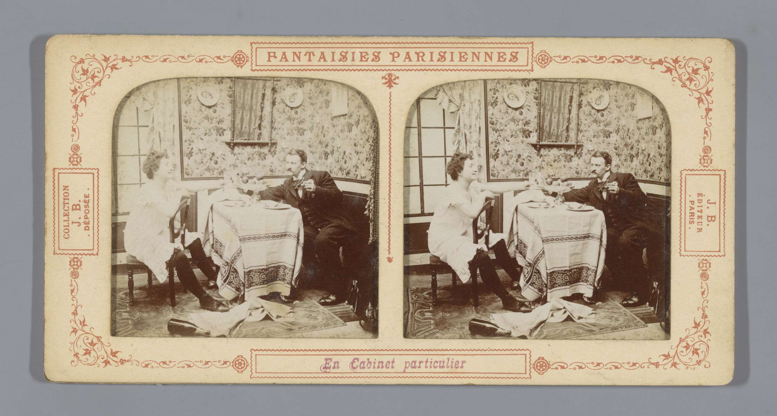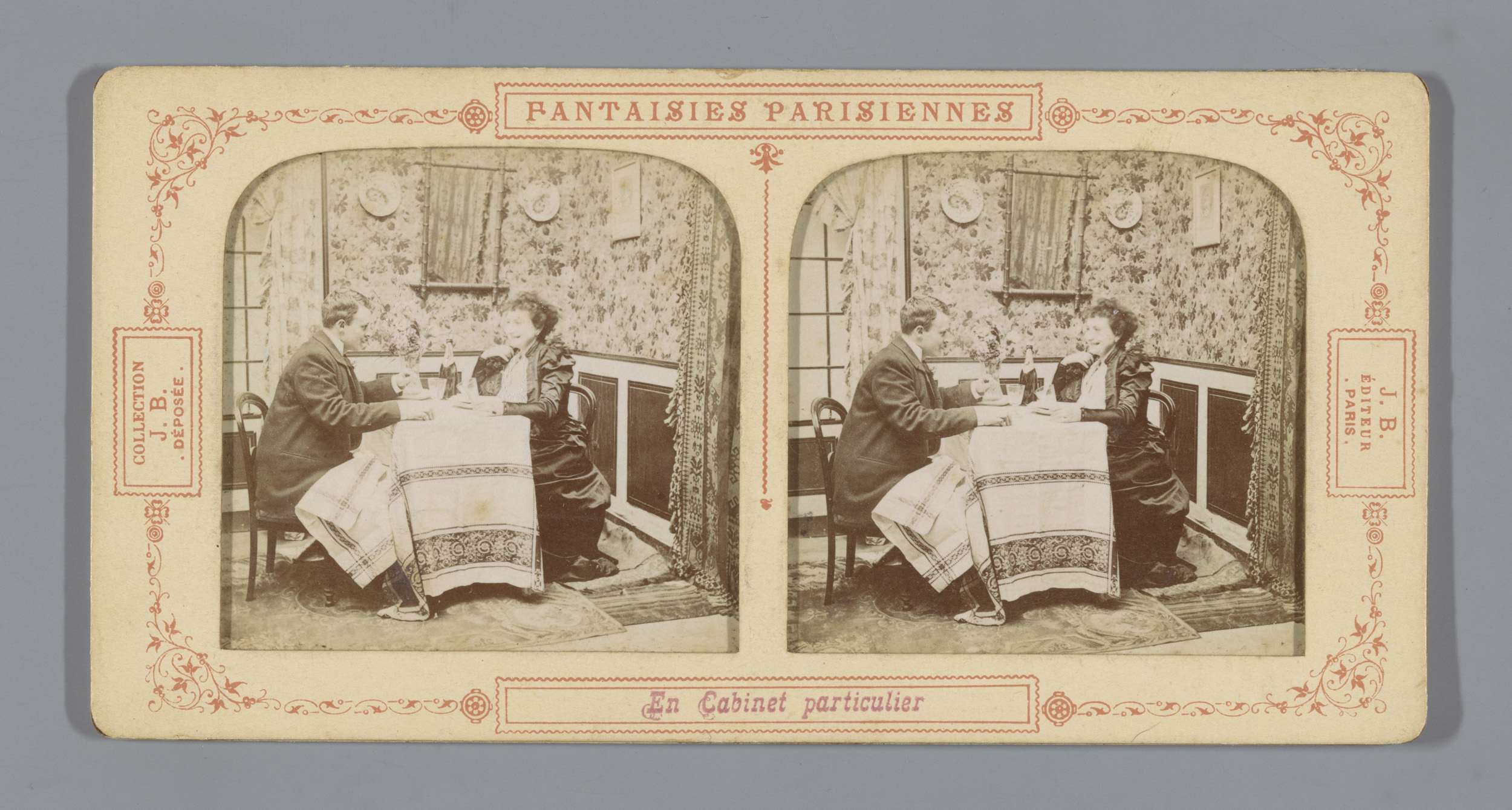 Man en vrouw tijdens een maaltijd, vrouw poseert voo...