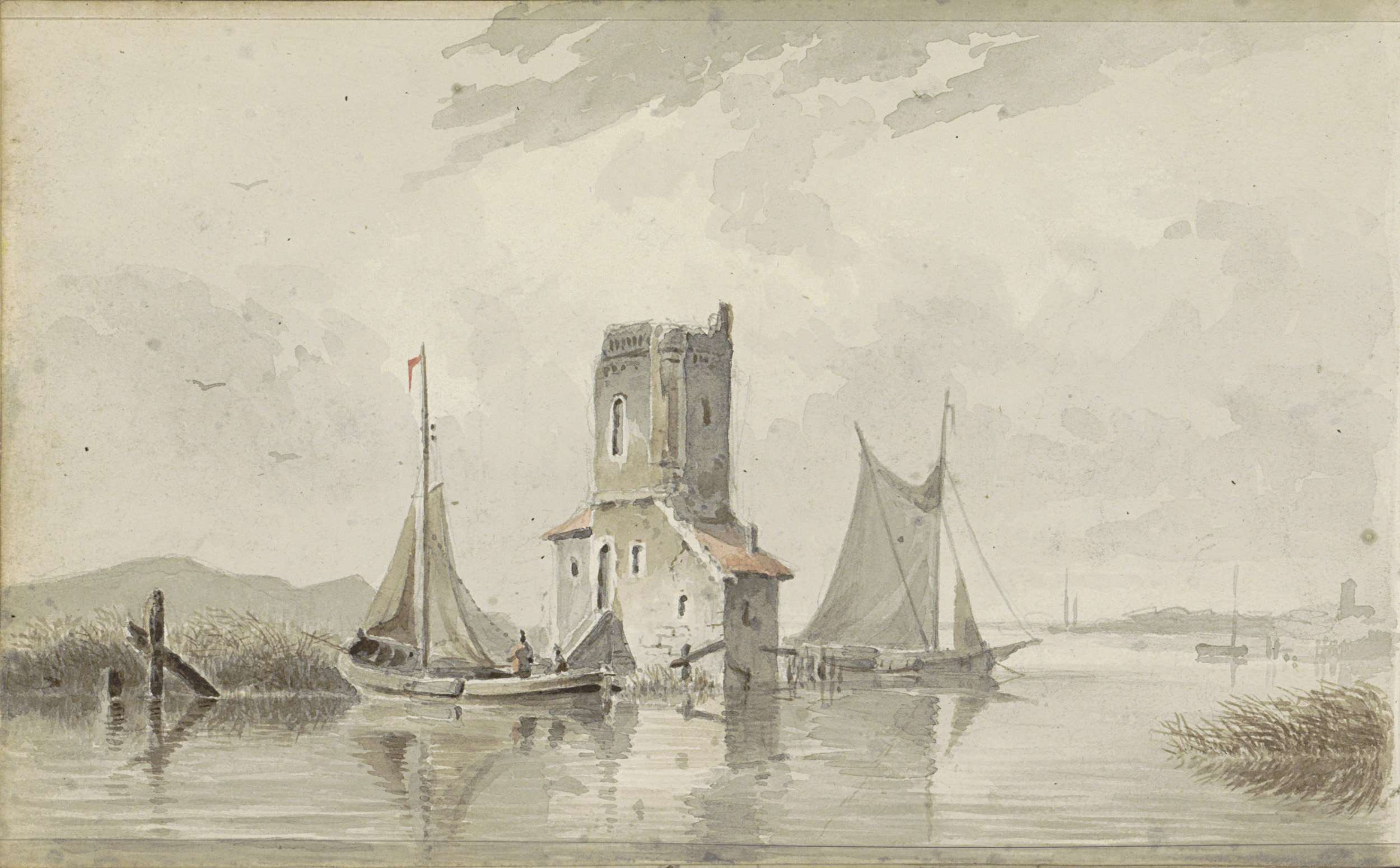 Rivierlandschap met een toren