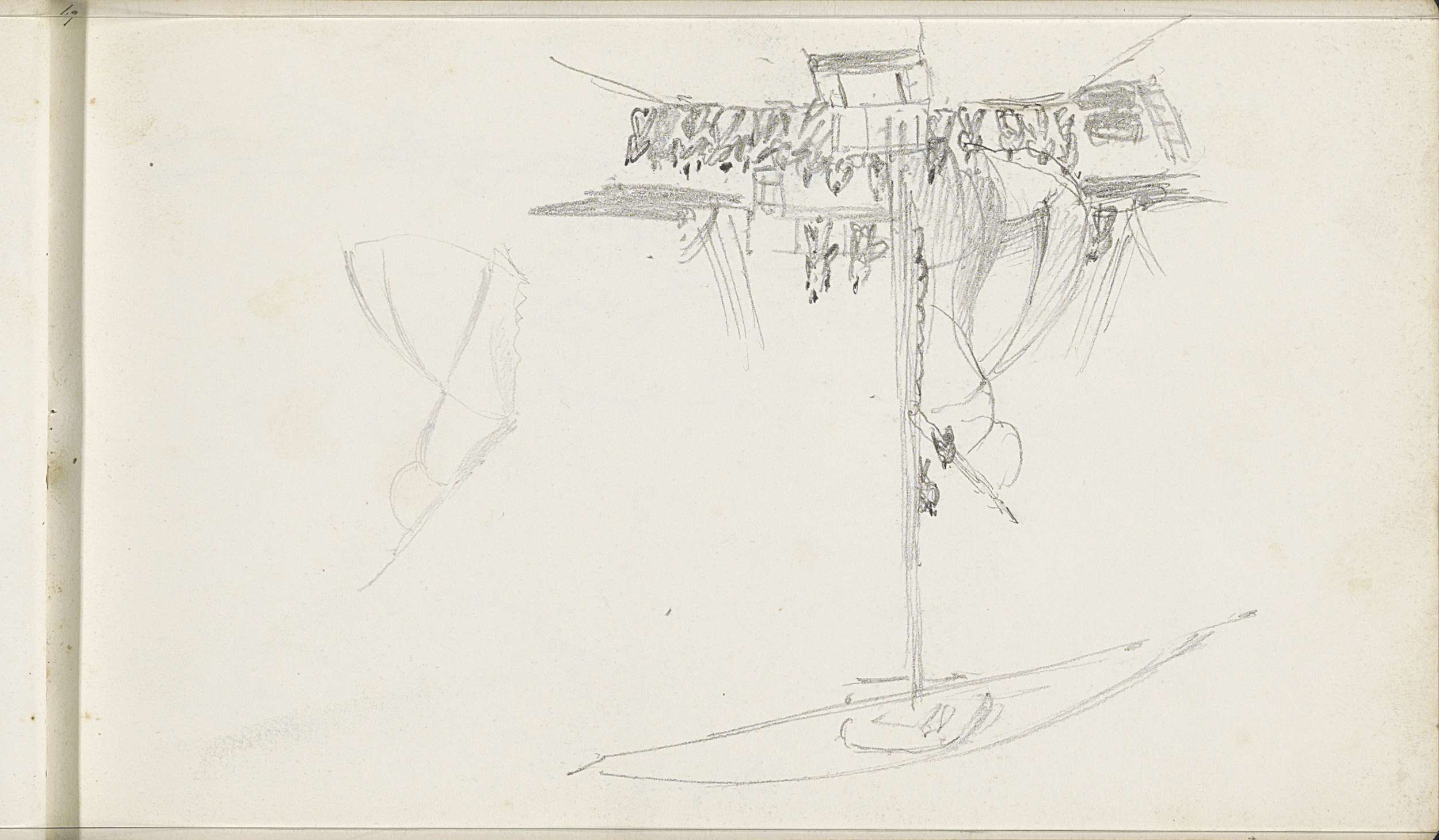Hoek van een stenen gevel met een lantaarn en zeilsc...