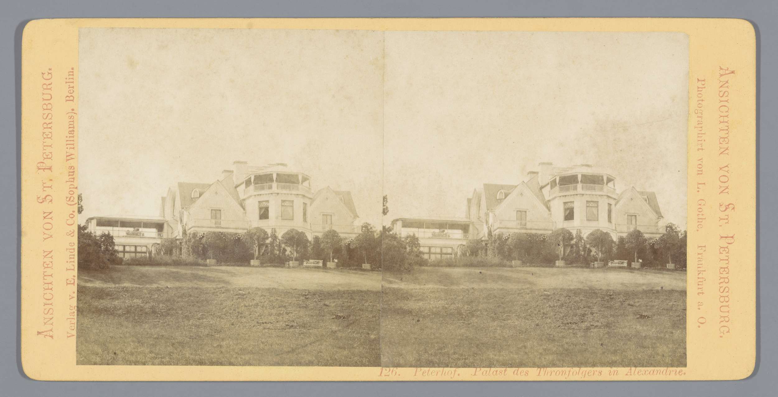 Gezicht op een paleis in het Alexandriapark te Peterhof