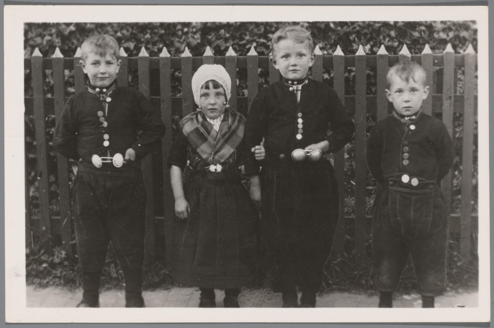 Drie jongens en een meisje in Urker streekdracht, ci...