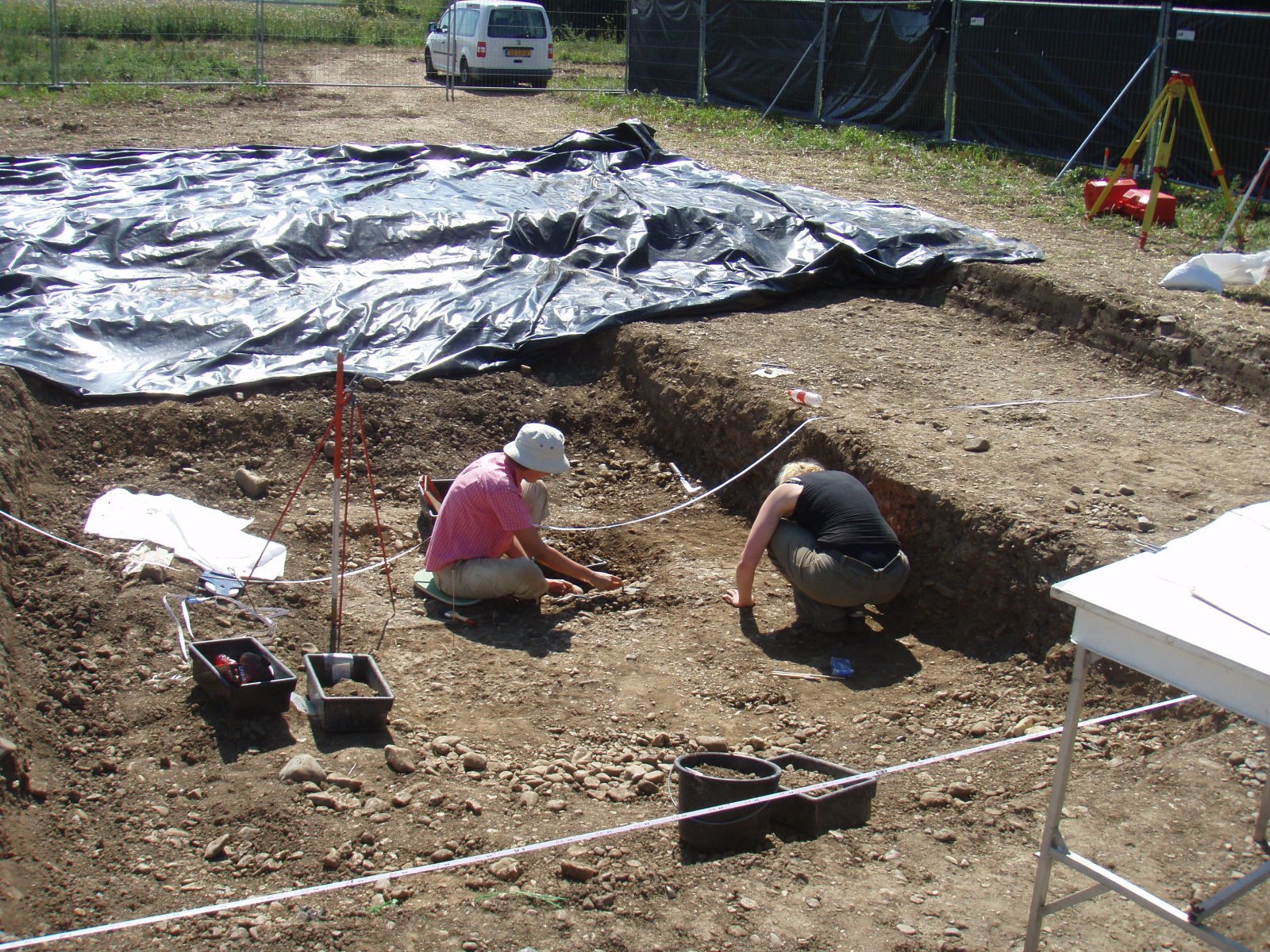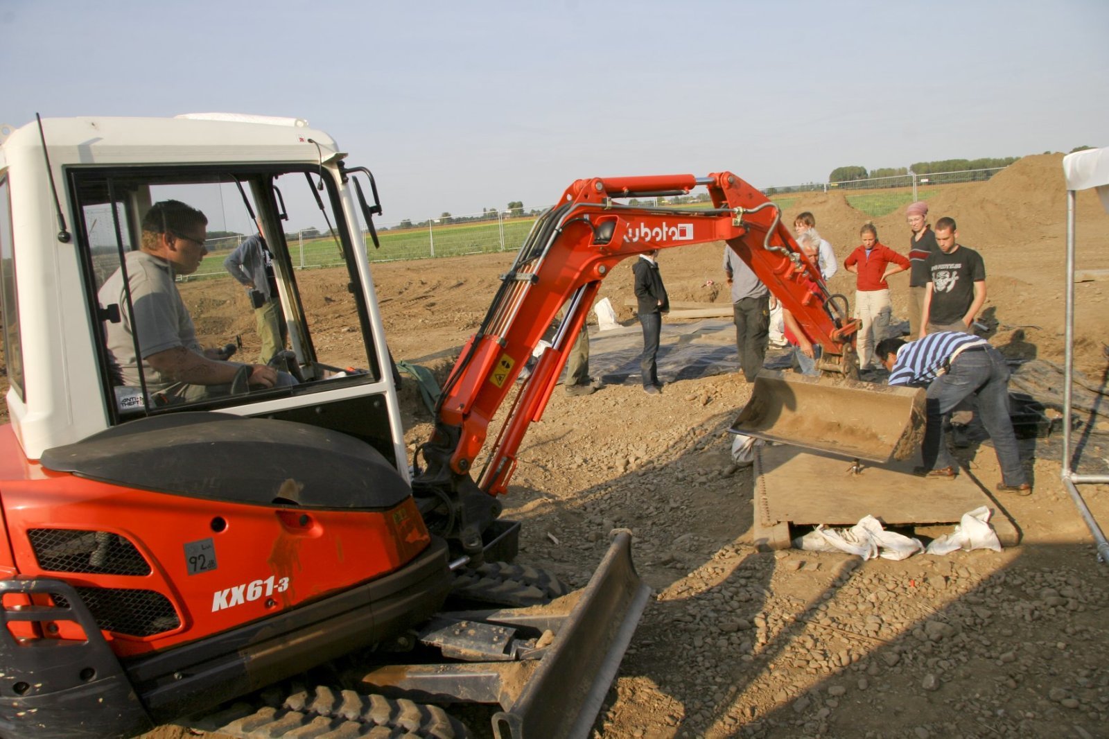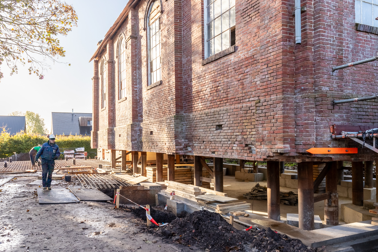 Funderingswerkzaamheden, met omhoog gevijzelde kerk