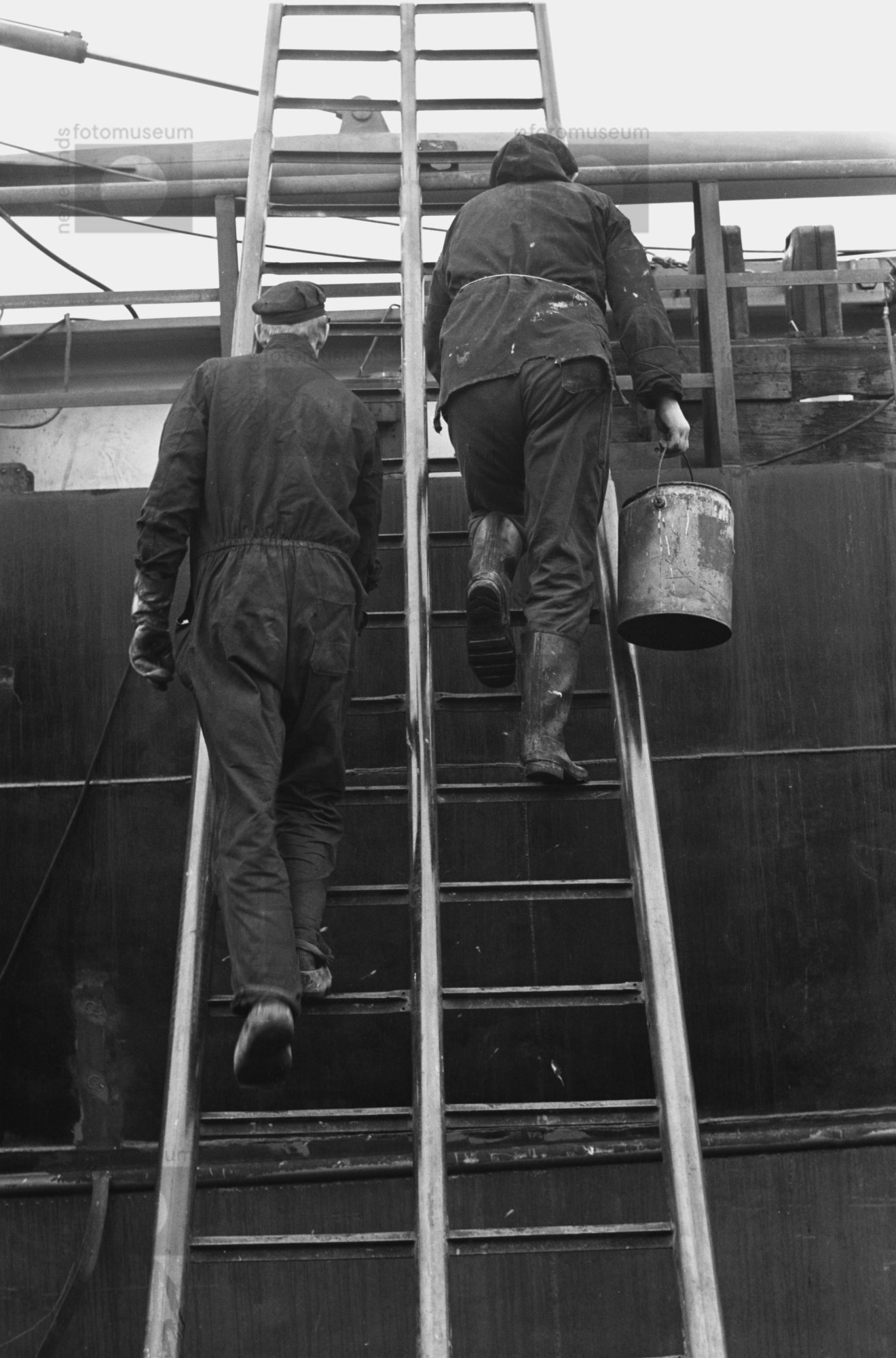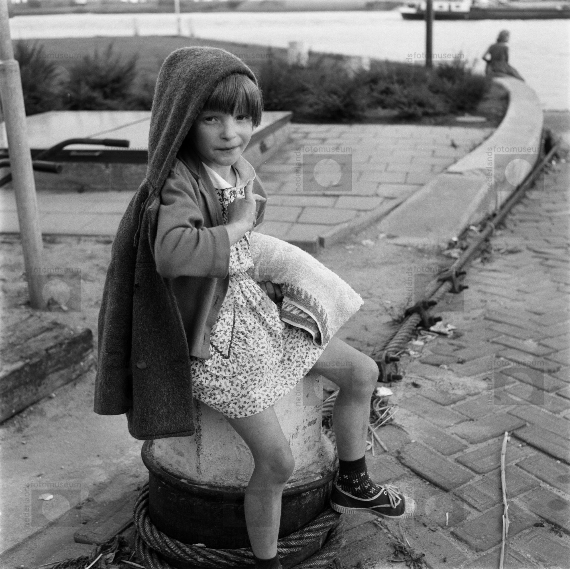 Amsterdam. Meisje zit op een scheepsbolder langs de ...