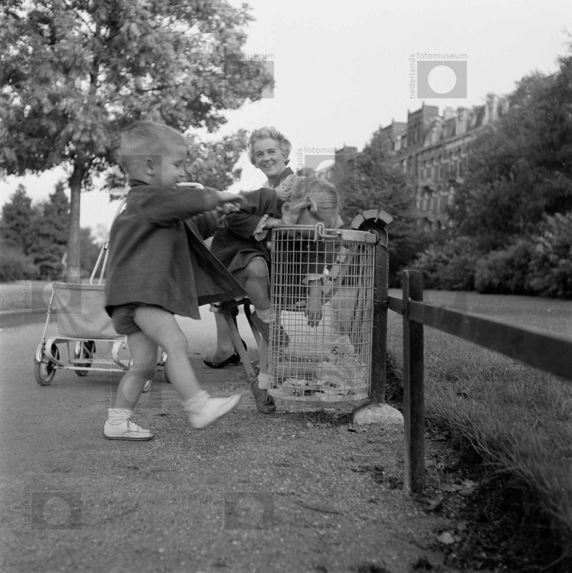 Amsterdam,Vondelpark. Kinderen spelen bij een vuilni...