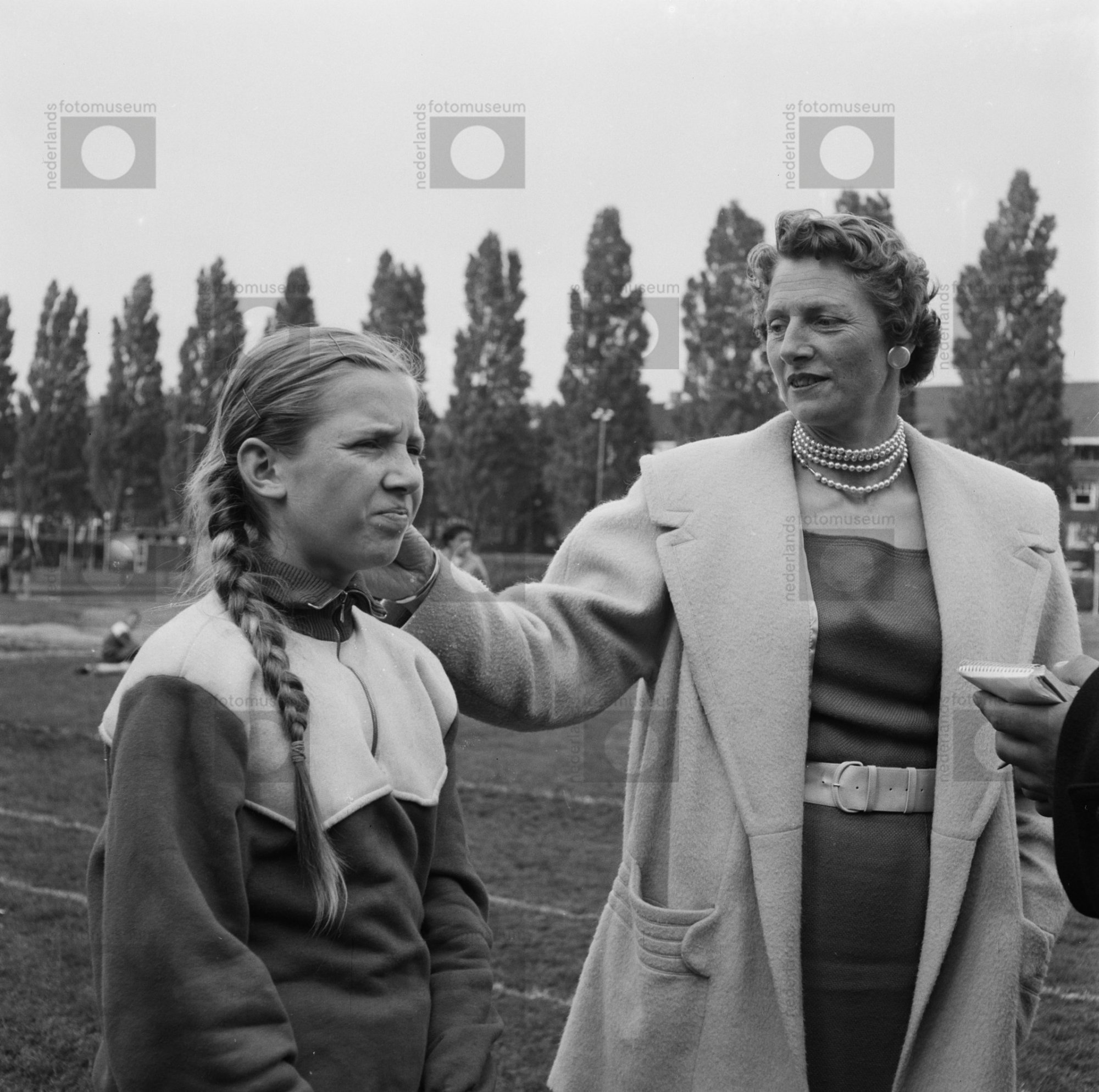 Atletiek. Fanny Blankers-Koen traint haar dochter op...