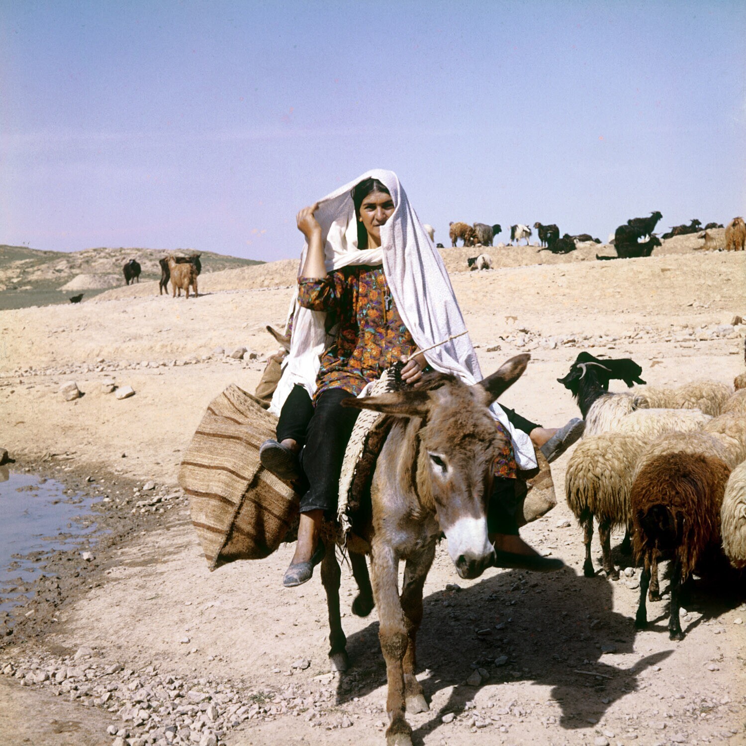 Nomadenvrouw op een ezeltje, bij een drinkplaats voo...
