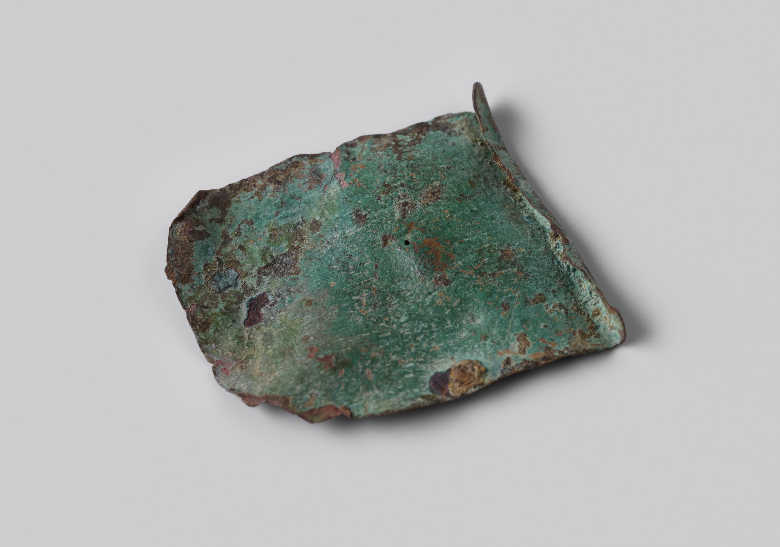 Fragment koperen plaatwerk met klinknagel uit het wr...