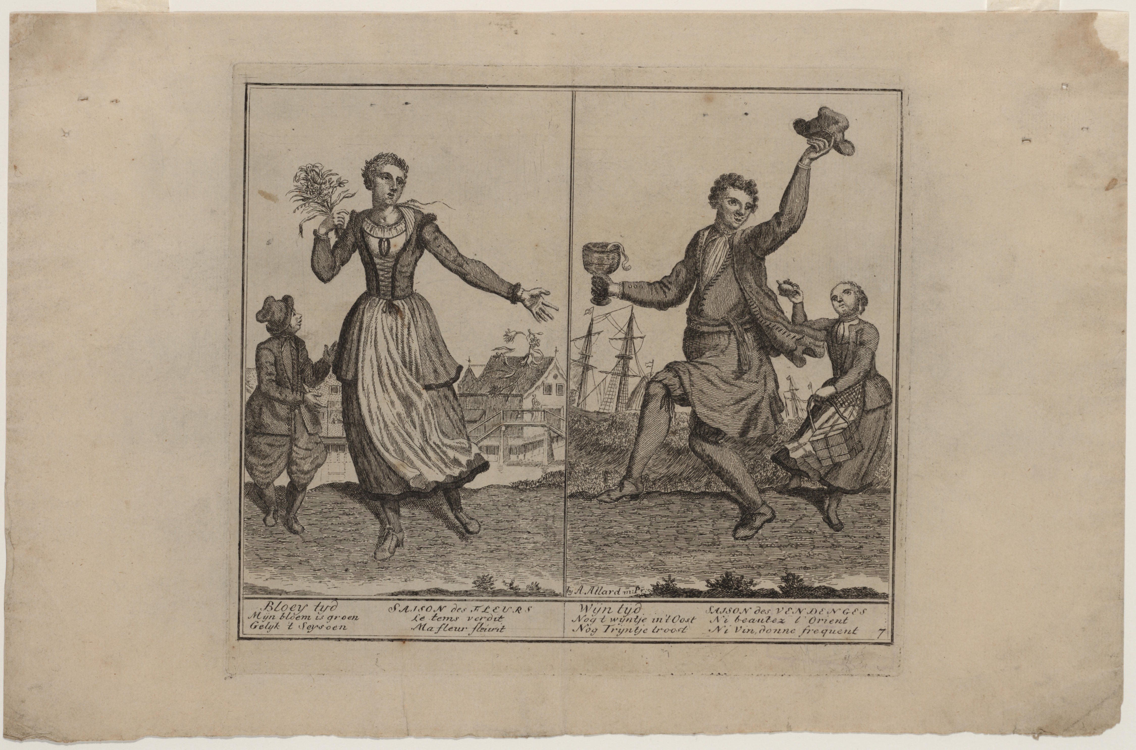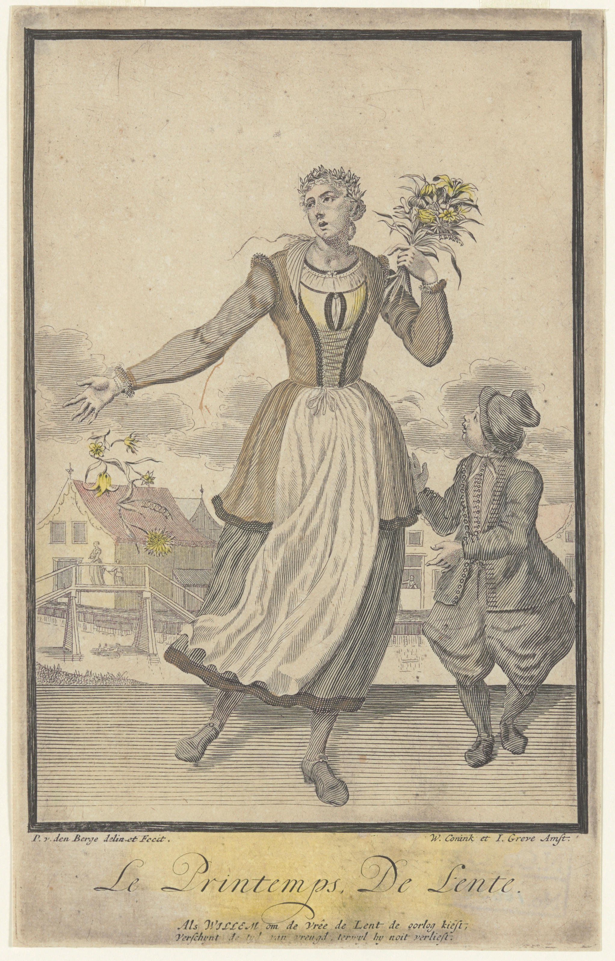 Prent van jongen en vrouw met bloemen, circa 1695