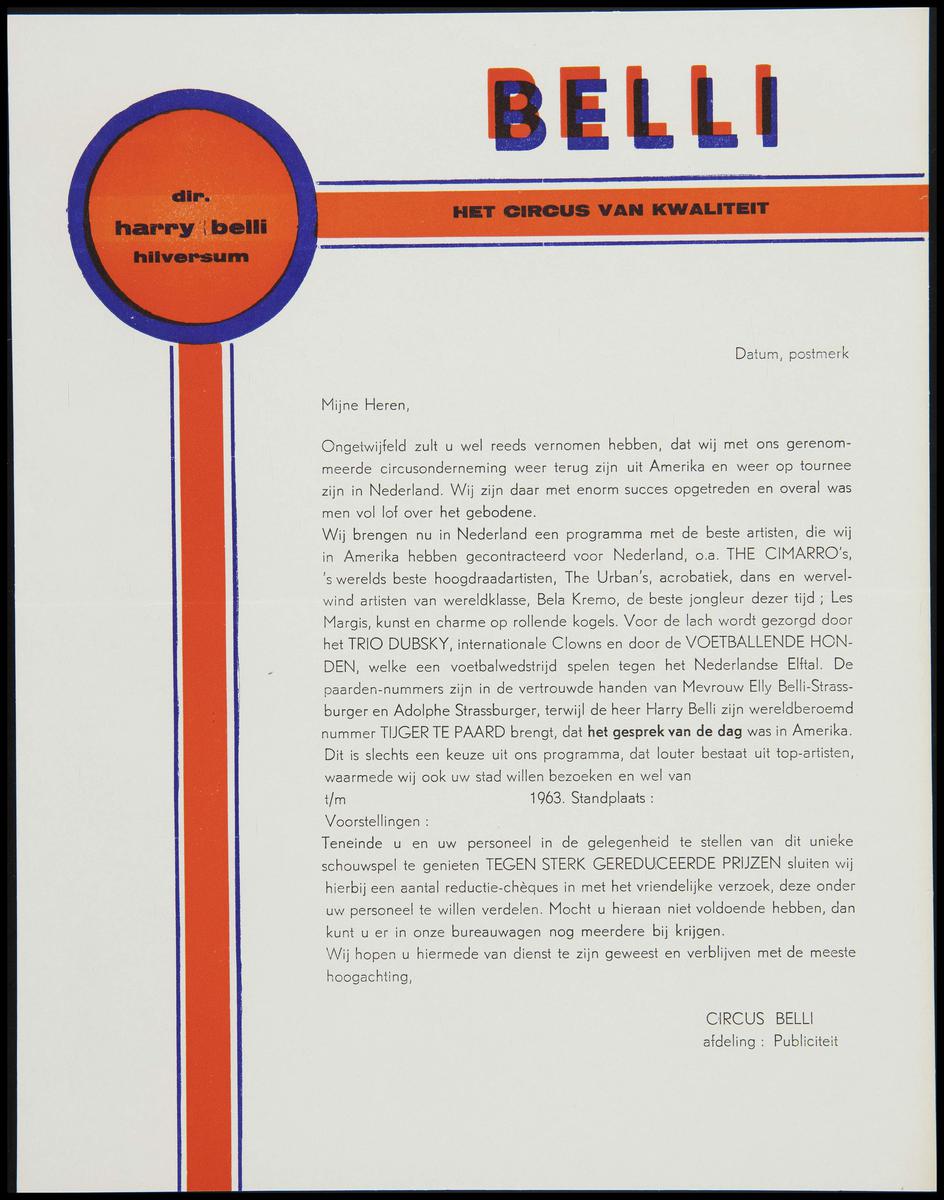 Promotiebrief Circus Harry Belli