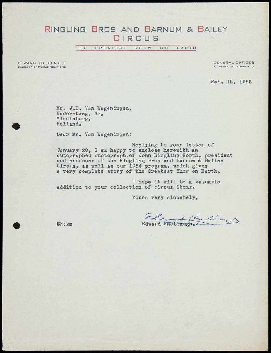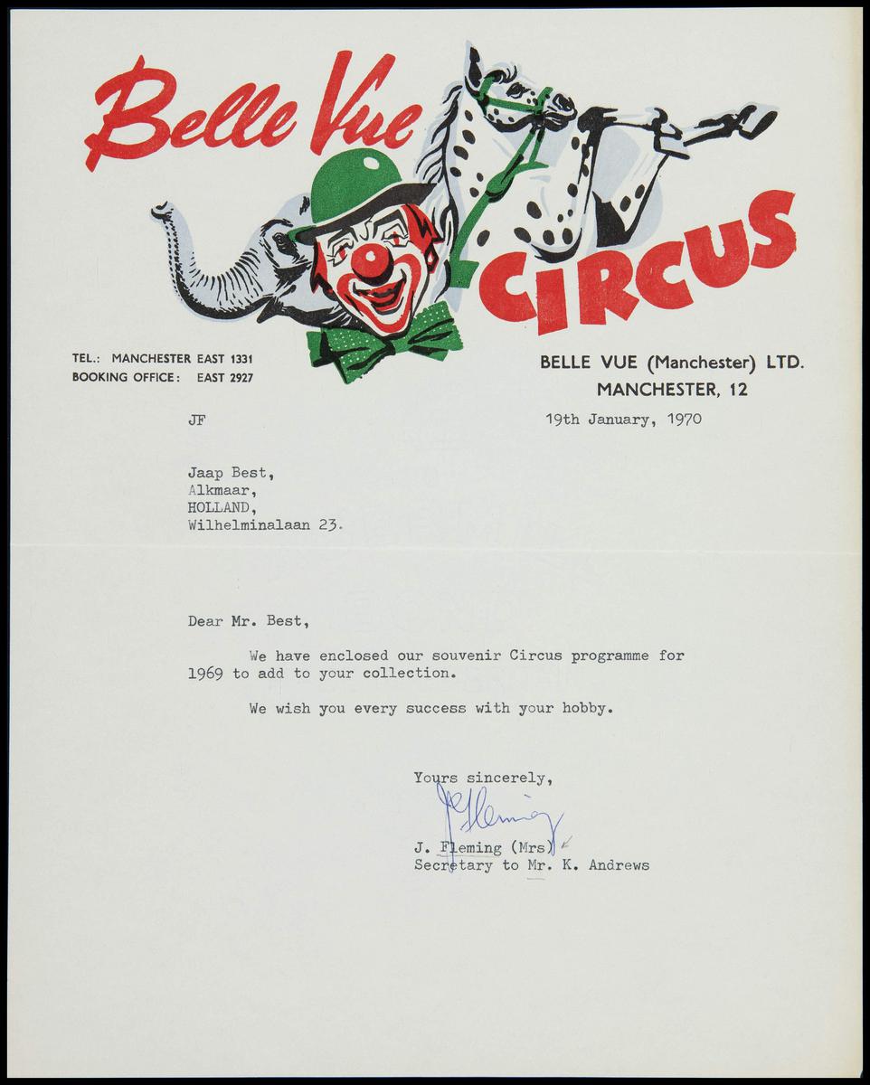Brief Circus Ringling Barnum & Bailey aan Jaap Best