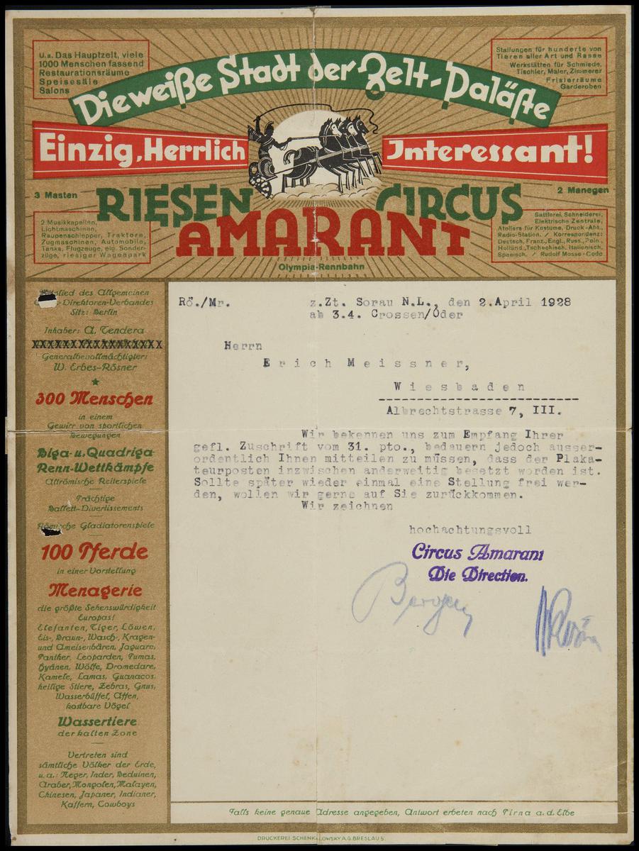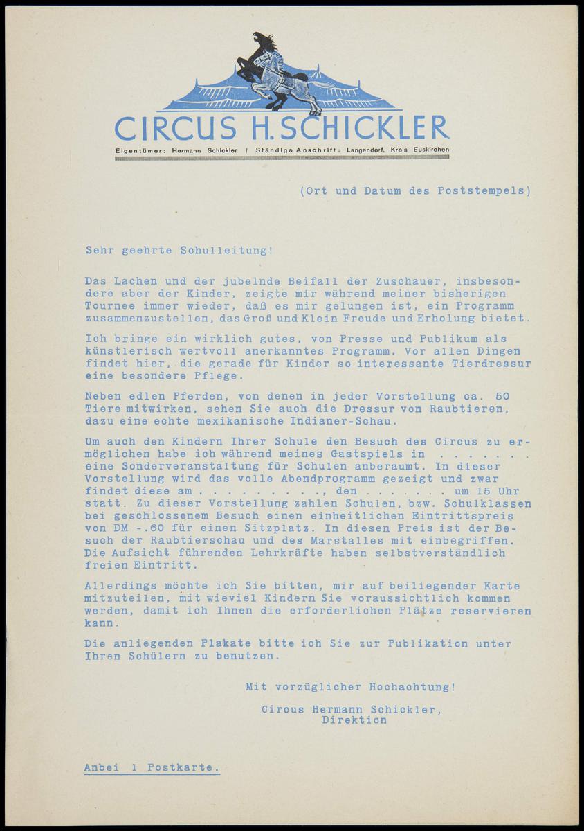 Promotiebrief Circus Hermann Schickler