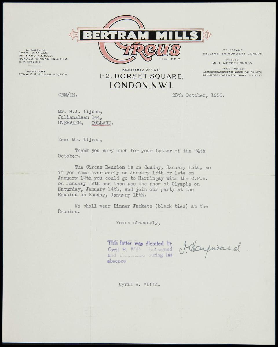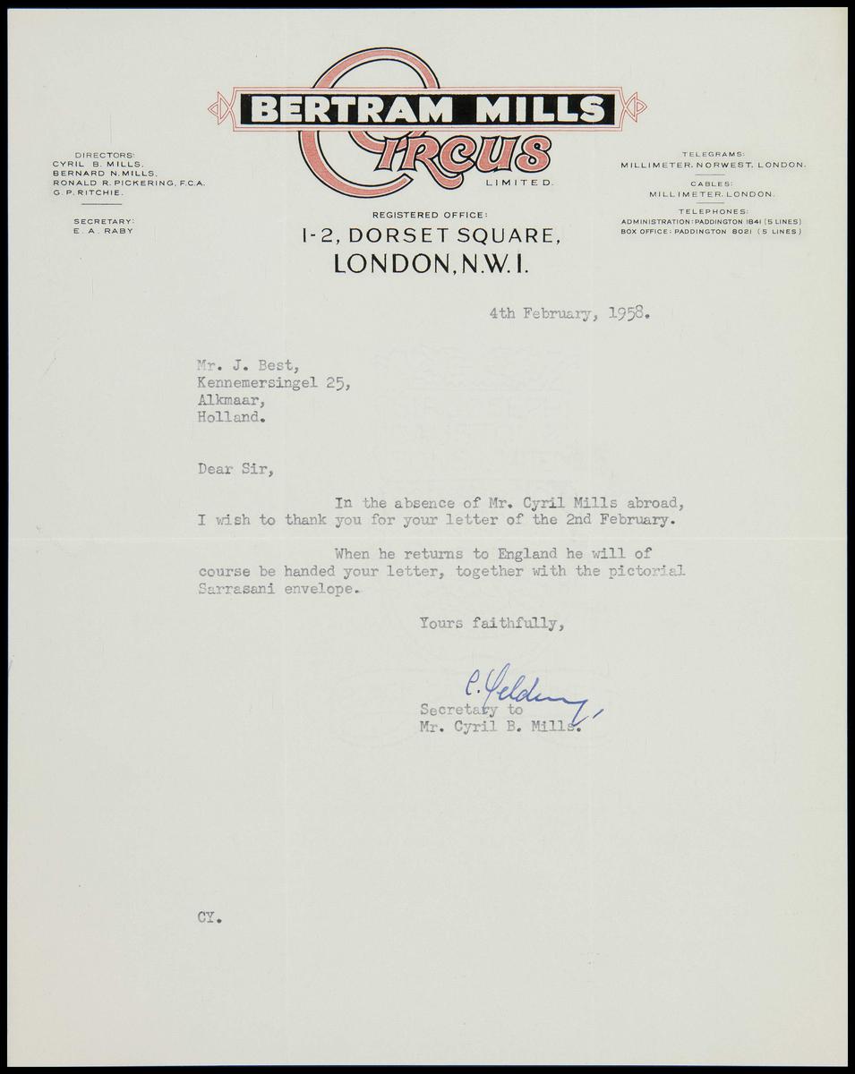 Brief Circus Betram Mills aan Jaap Best
