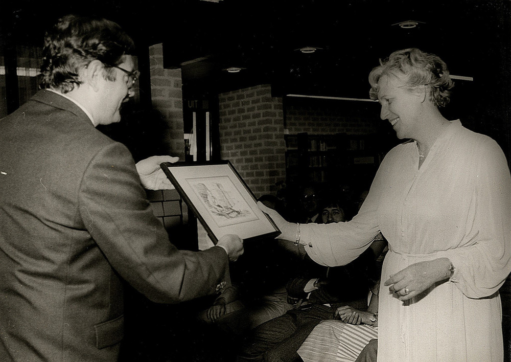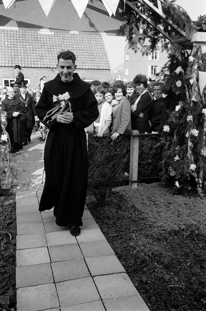 Links Burgemeester Stolk, overhandigt bos bloemen aa...