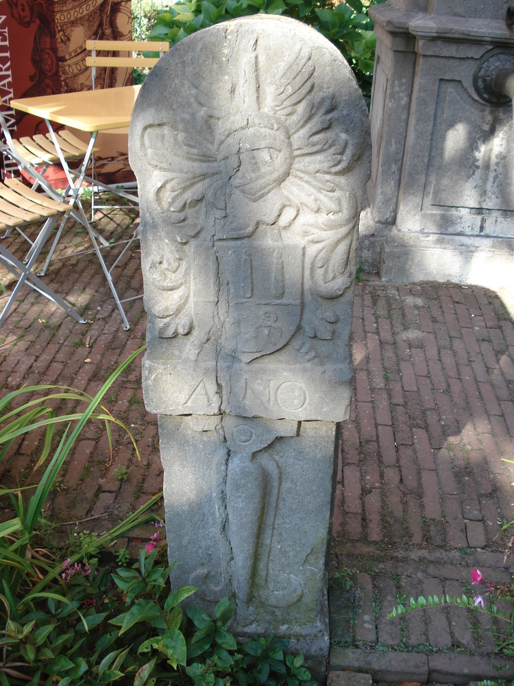 stoeppalen van hardsteen en afbeelding van helm met ...