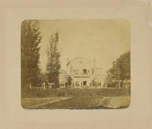 Zwart wit foto van een buitenhuis, waarschijnlijk bu...