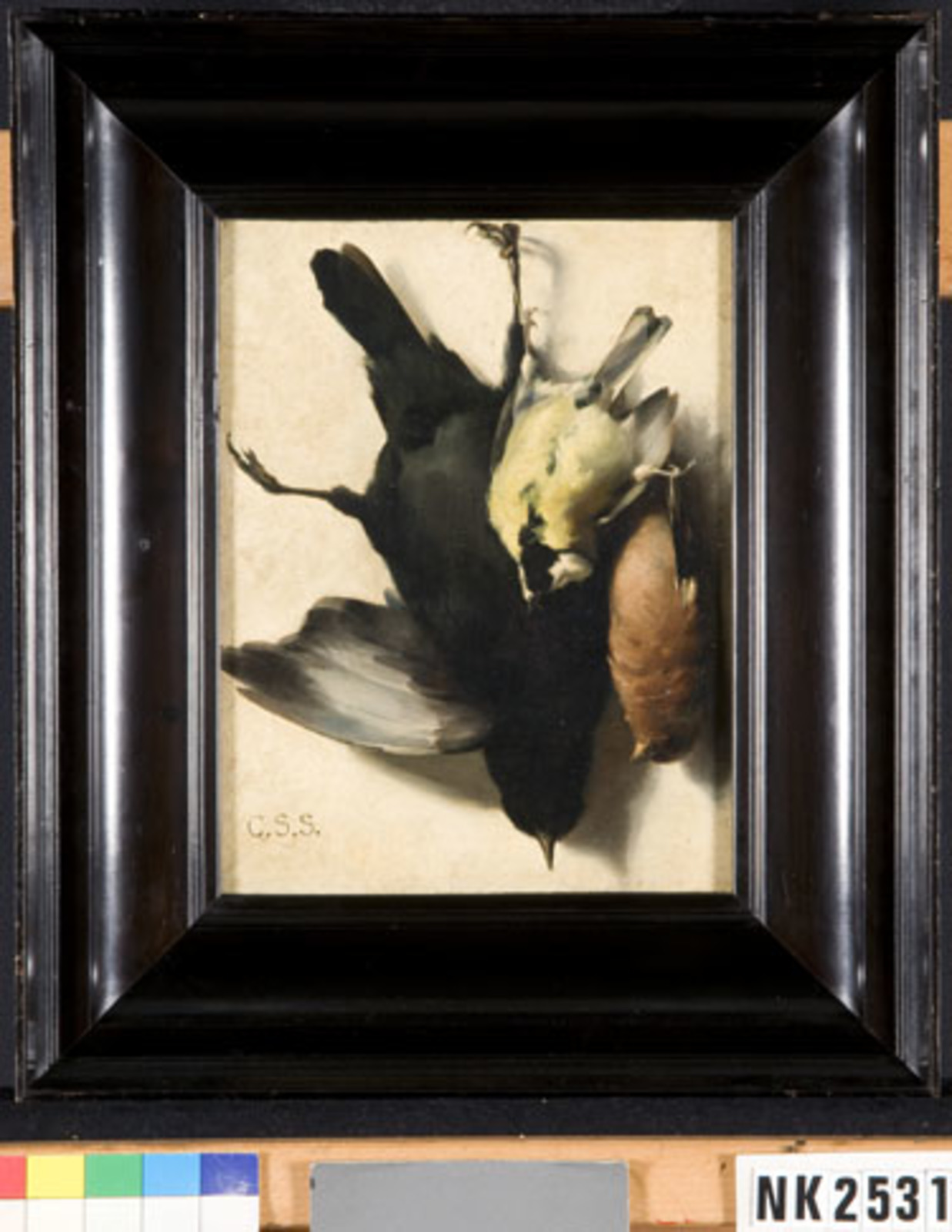 Stilleven met een dode kauw, koolmees en vink