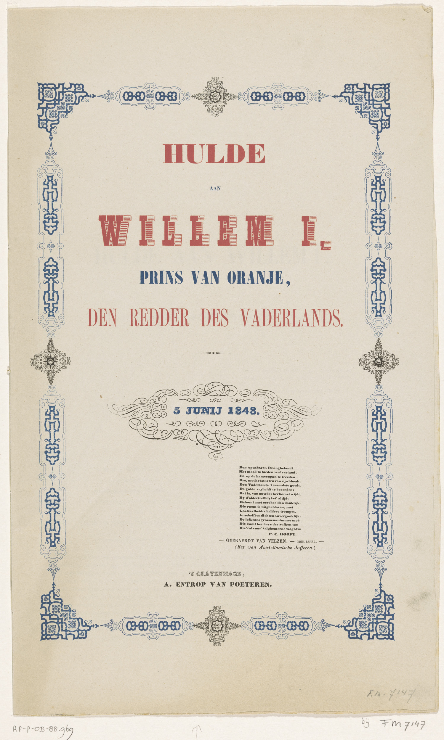 Hulde aan Willem I, prins van Oranje, den redder des...