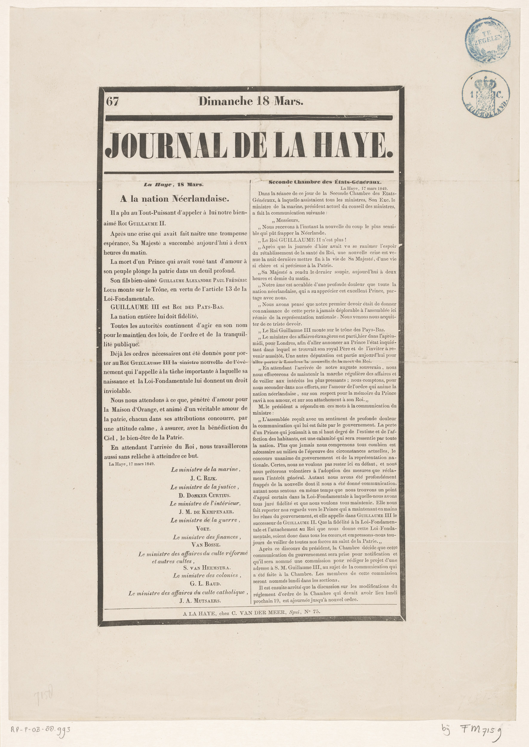 Journal de La Haye van 18 maat 1849 met het nieuws v...