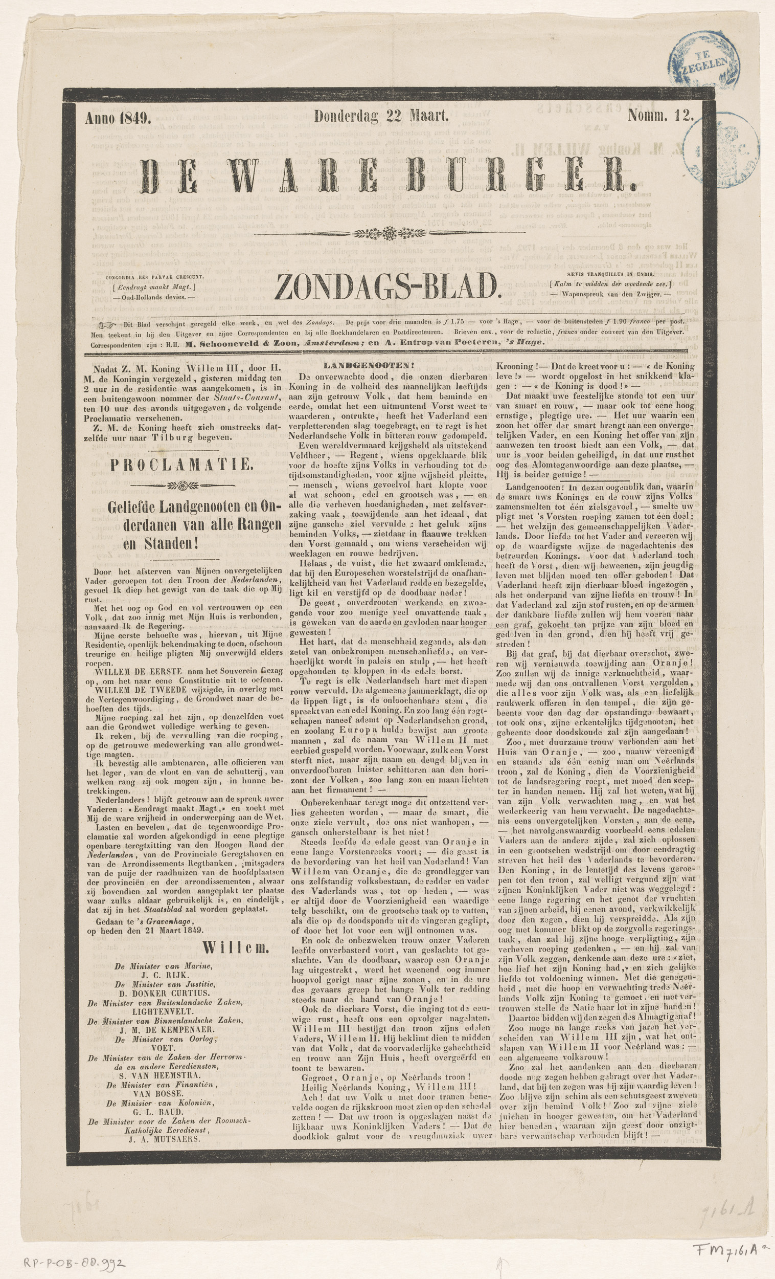 Staatsblad met de proclamatie van koning Willem III,...