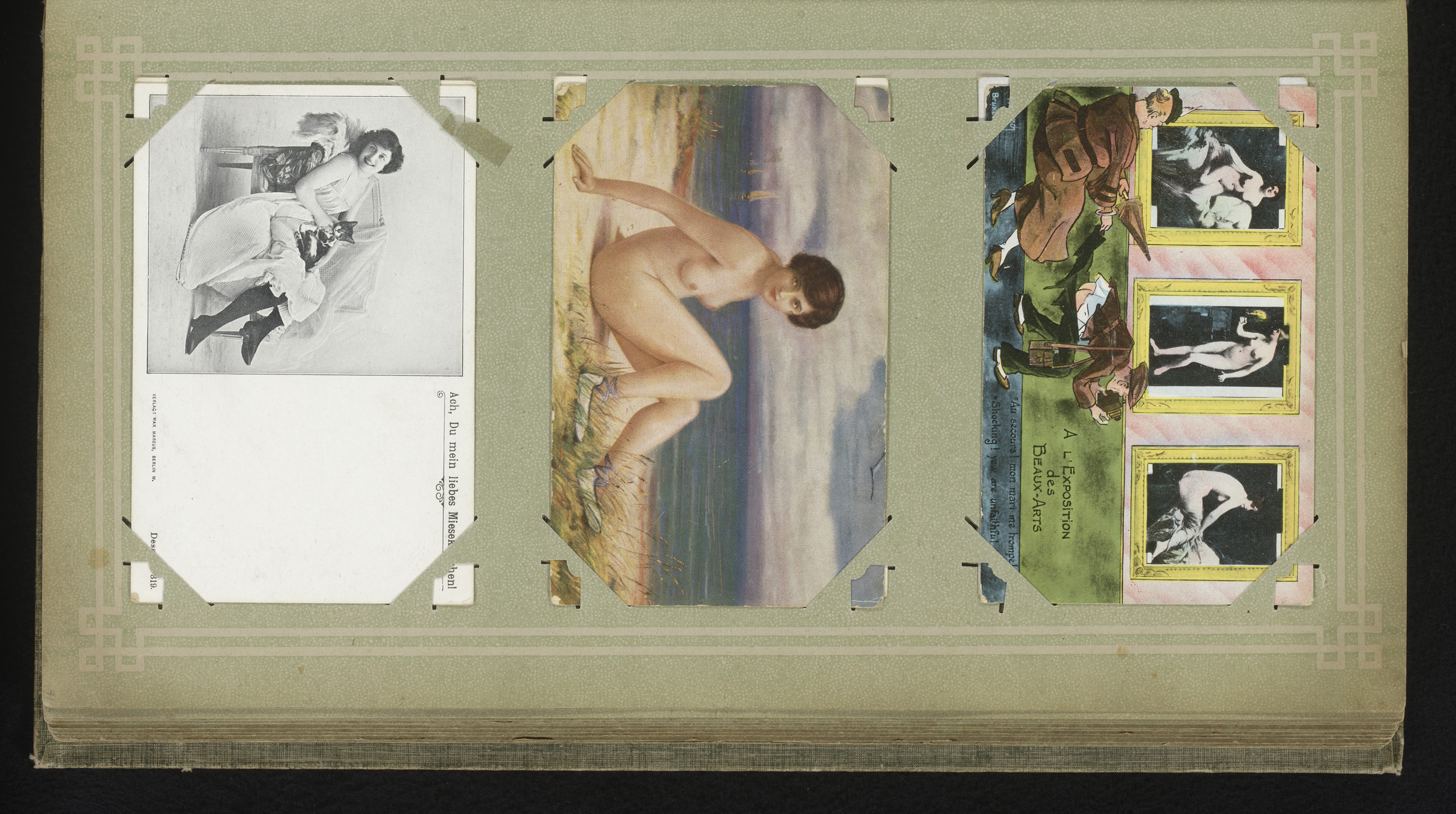 Twee reproducties van ontwerpen met naakte vrouwen e...