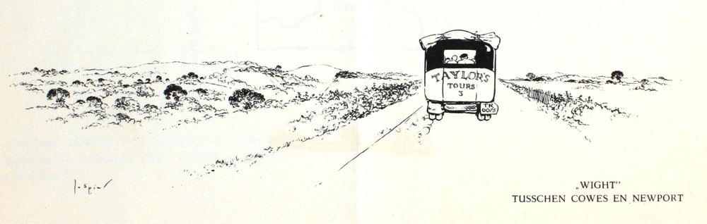 Illustratie door Jo Spier van een bus in een vlak wi...
