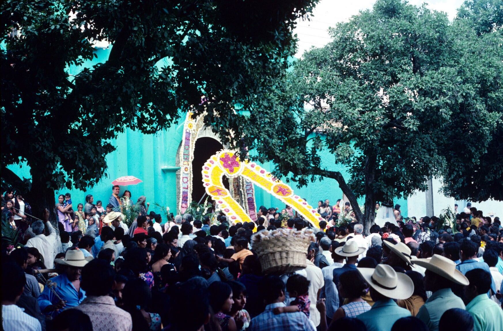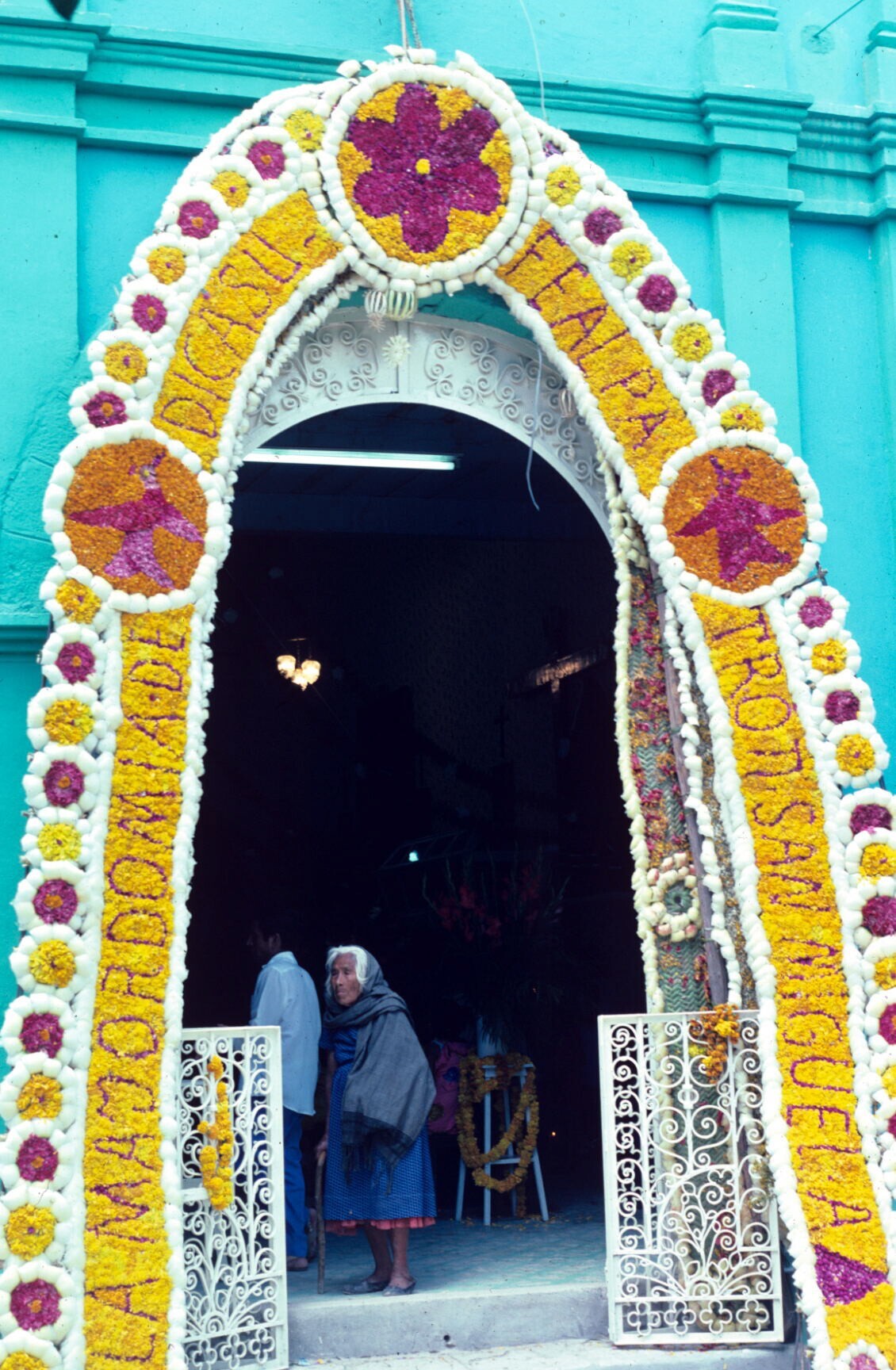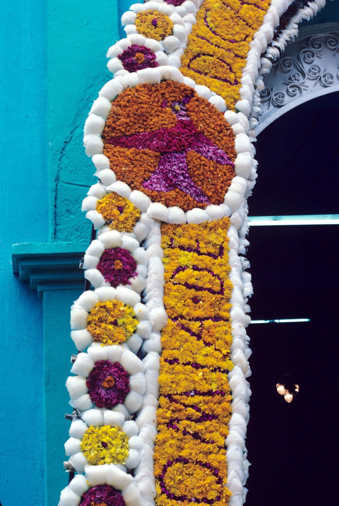 met bloemenmozaïek versierde kerkingang