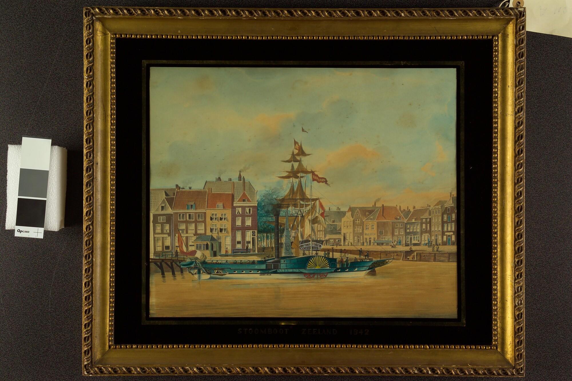 Lithografie van de haven van het Nieuwe Diep, met dr...