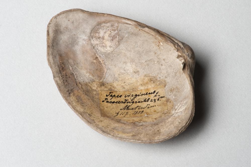 Schelp Polititapes (Tapes) virgineus, uit een boring...
