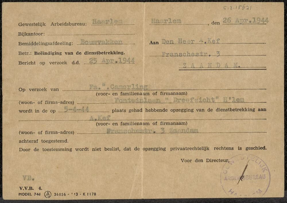 Brief van het Gewestelijk Arbeidsbureau Haarlem aan ...