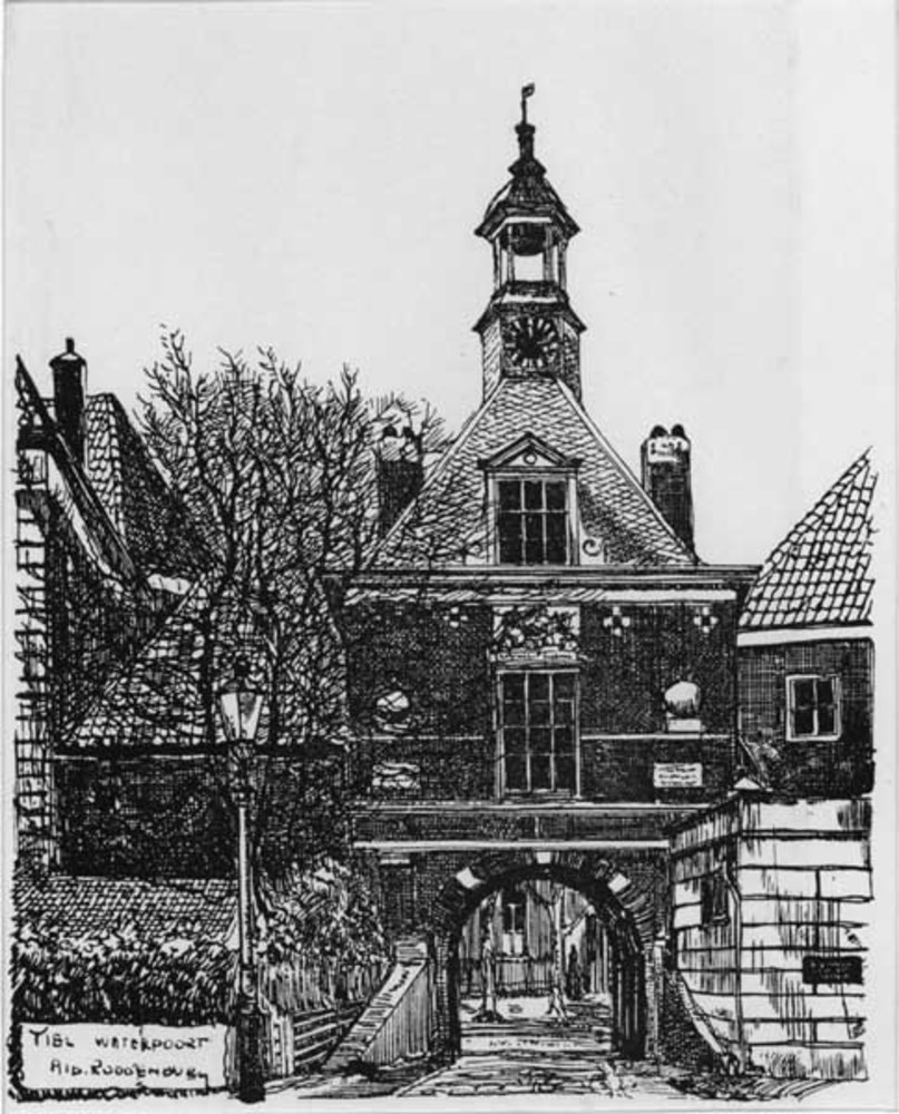 Ets, voorstellende de Waterpoort te Tiel vanaf de Wa...